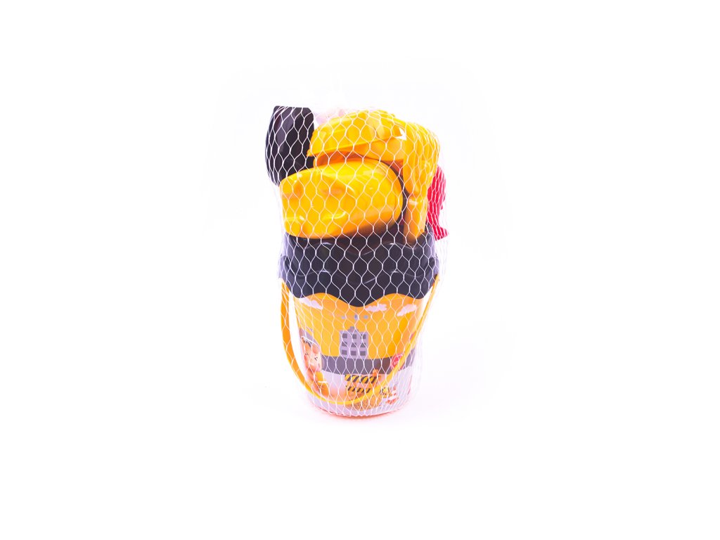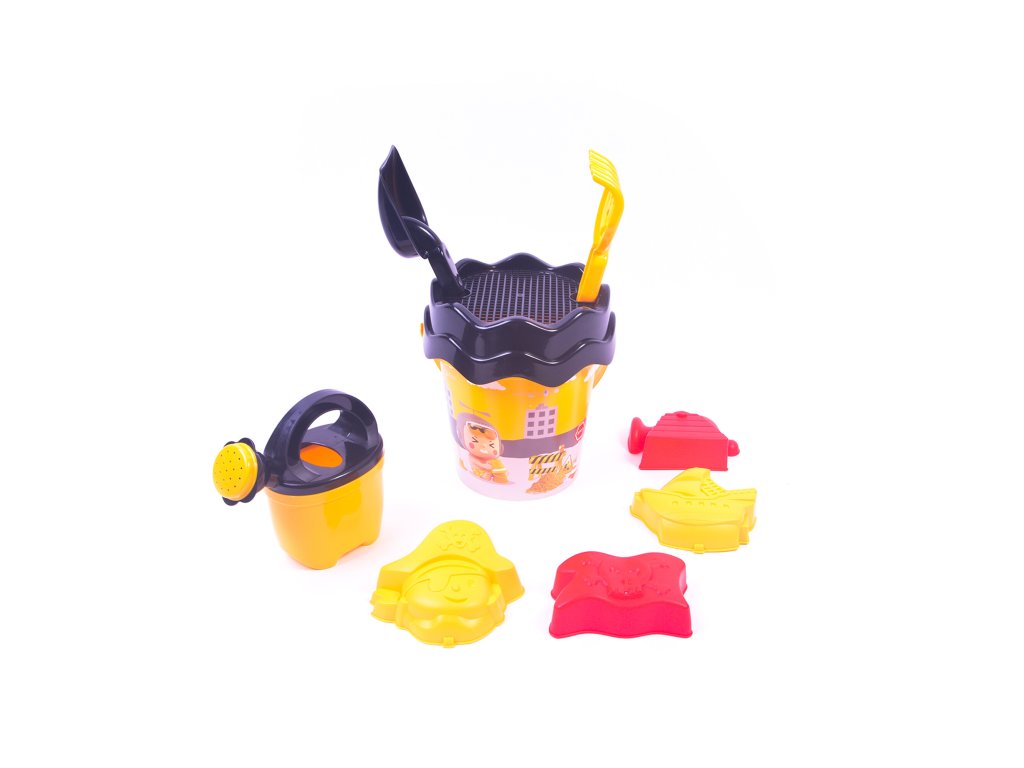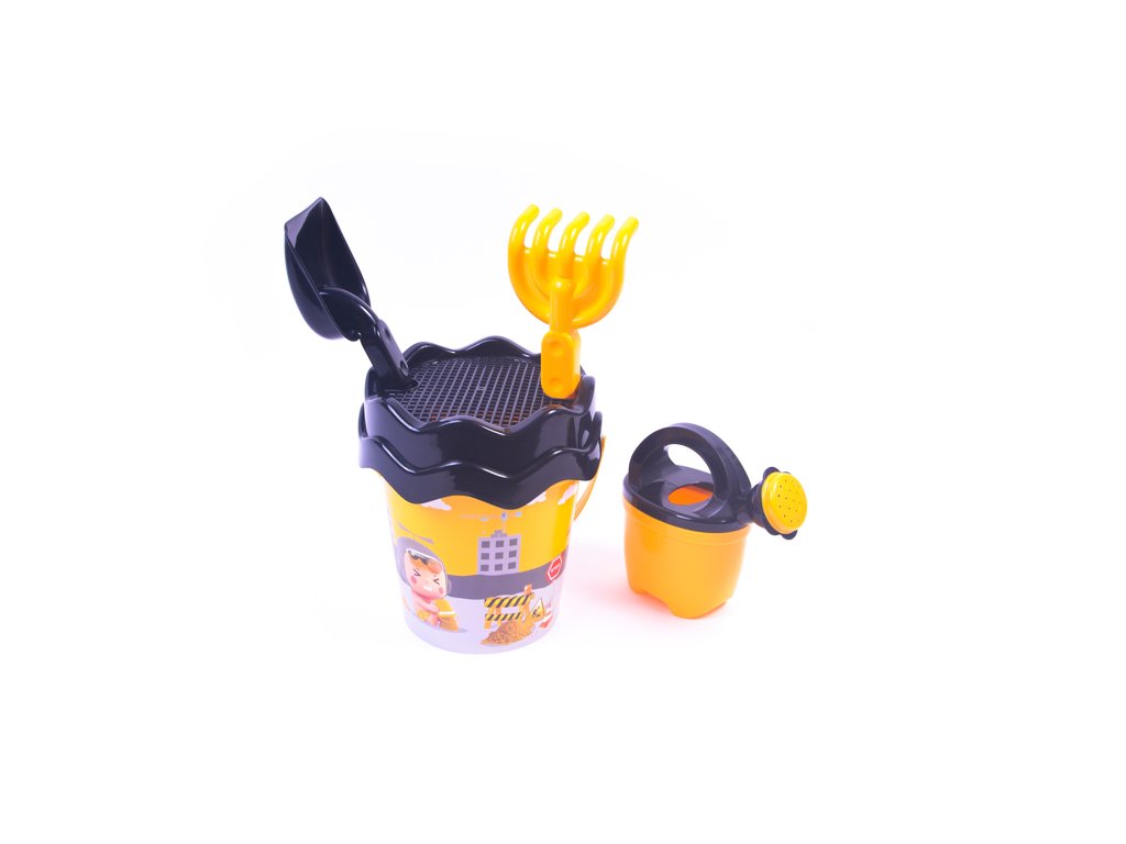 Sada obsahuje: Sítko, lopatku, hrábě, kyblík, konvičku a bábovičky.