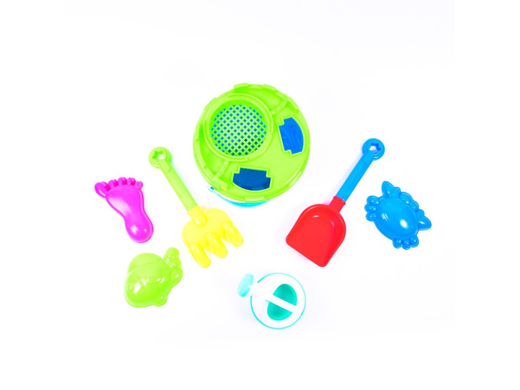 Sada obsahuje: Sítko, lopatku, hrábě, kyblík, konvičku a bábovičky.