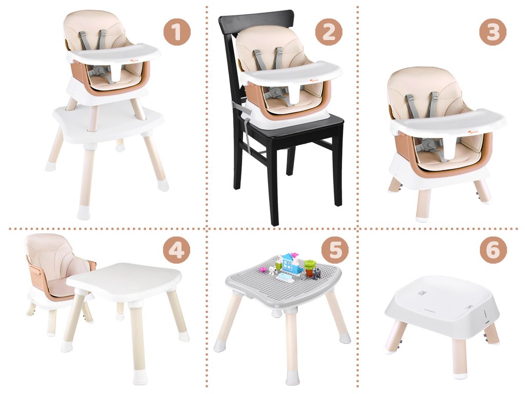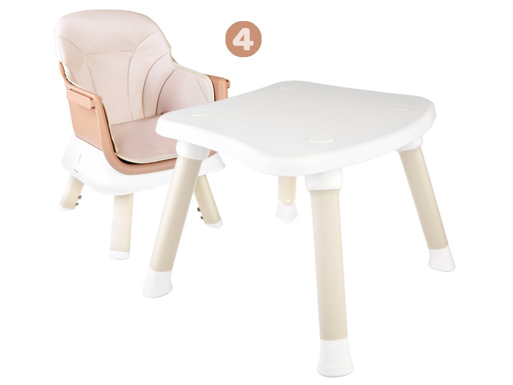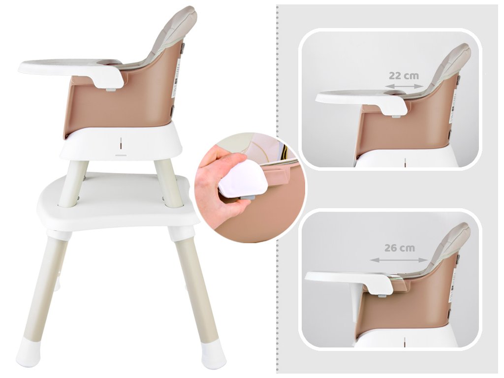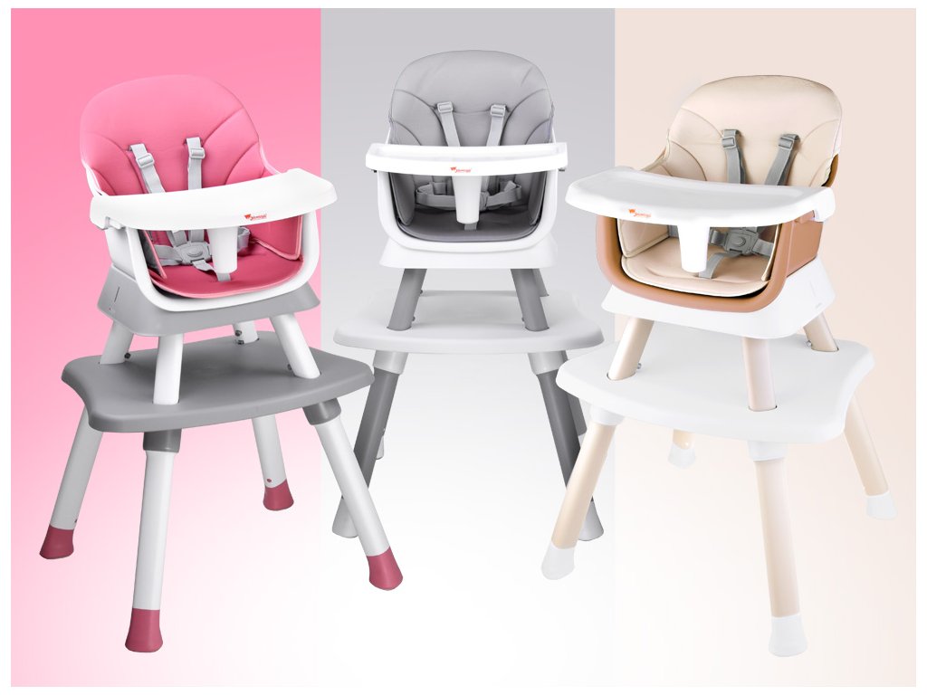 Dětská jídelní židlička 6v1 je ideální pro děti od 6 měsíců, které začaly samy sedět. Skládací židlička v moderním stylu se bude hodit do každého dětského, obývacího pokoje nebo kuchyně. Díky své možnosti použití v různých variantách se hodí jak k jídelnímu stolu, tak do dětského koutku na hraní. Pohodlné, správně profilované sedadlo s pětibodovými bezpečnostními pásy a zámkem proti sklouznutí ze židle. Čalounění použité k čalounění sedačky je prodyšné a ze snadno čistitelného materiálu, který je důležitý pro udržení čistoty nábytku. Židlička má vyjímatelný, snadno čistitelnou plochu ke krmení. Nohy židle mají protiskluzové podložky. Multifunkční židlička poroste s dítětem a snadno se přizpůsobí požadovaným potřebám v dané situaci.