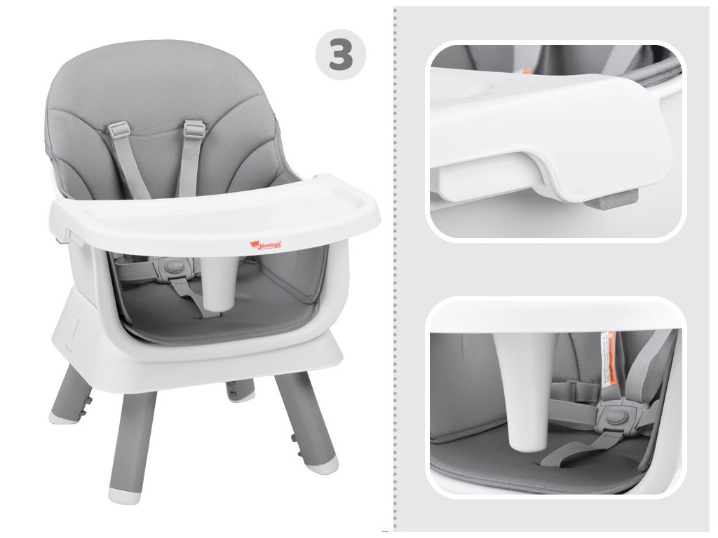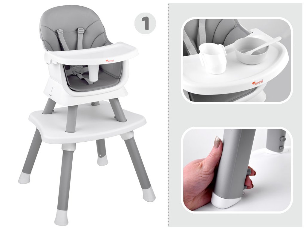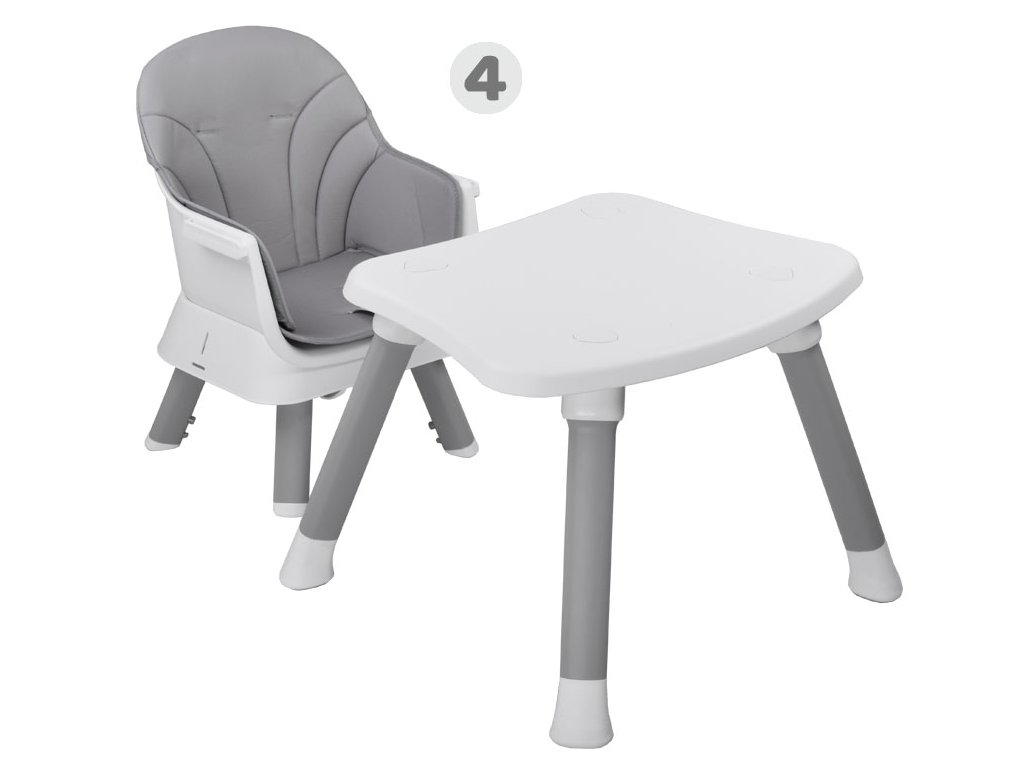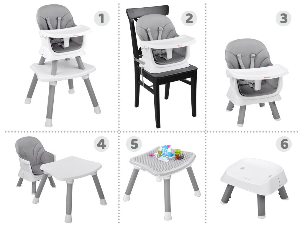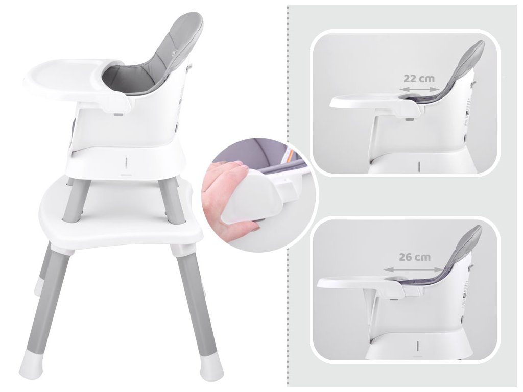 Dětská jídelní židlička 6v1 je ideální pro děti od 6 měsíců, které začaly samy sedět. Skládací židlička v moderním stylu se bude hodit do každého dětského, obývacího pokoje nebo kuchyně. Díky své možnosti použití v různých variantách se hodí jak k jídelnímu stolu, tak do dětského koutku na hraní. Pohodlné, správně profilované sedadlo s pětibodovými bezpečnostními pásy a zámkem proti sklouznutí ze židle. Čalounění použité k čalounění sedačky je prodyšné a ze snadno čistitelného materiálu, který je důležitý pro udržení čistoty nábytku. Židlička má vyjímatelný, snadno čistitelnou plochu ke krmení. Nohy židle mají protiskluzové podložky. Multifunkční židlička poroste s dítětem a snadno se přizpůsobí požadovaným potřebám v dané situaci.