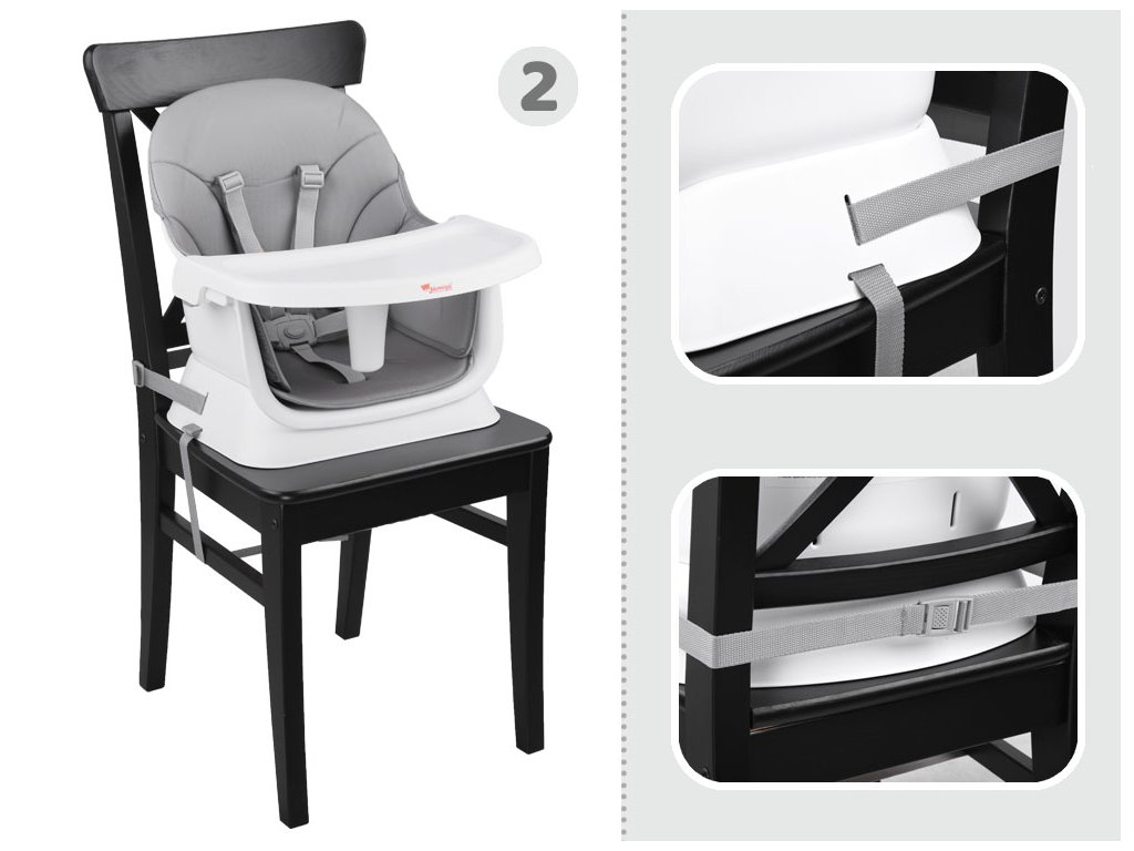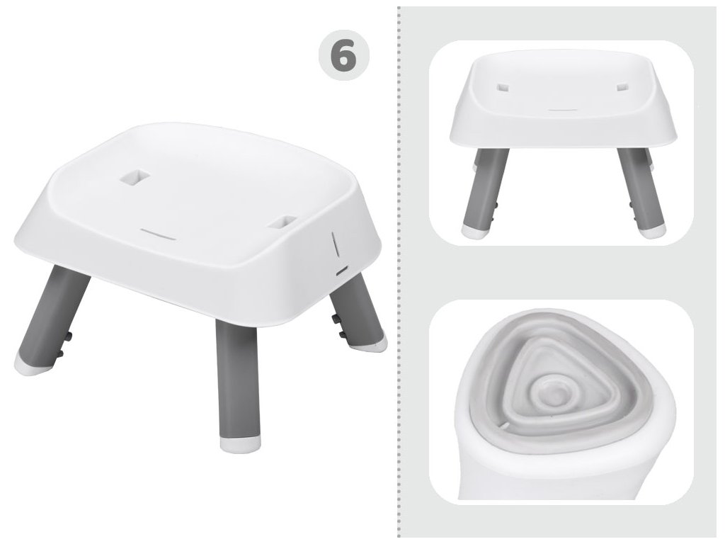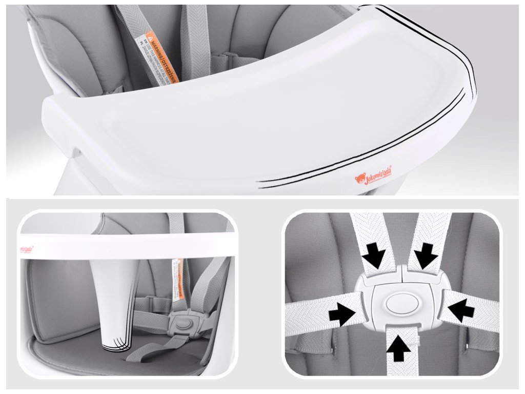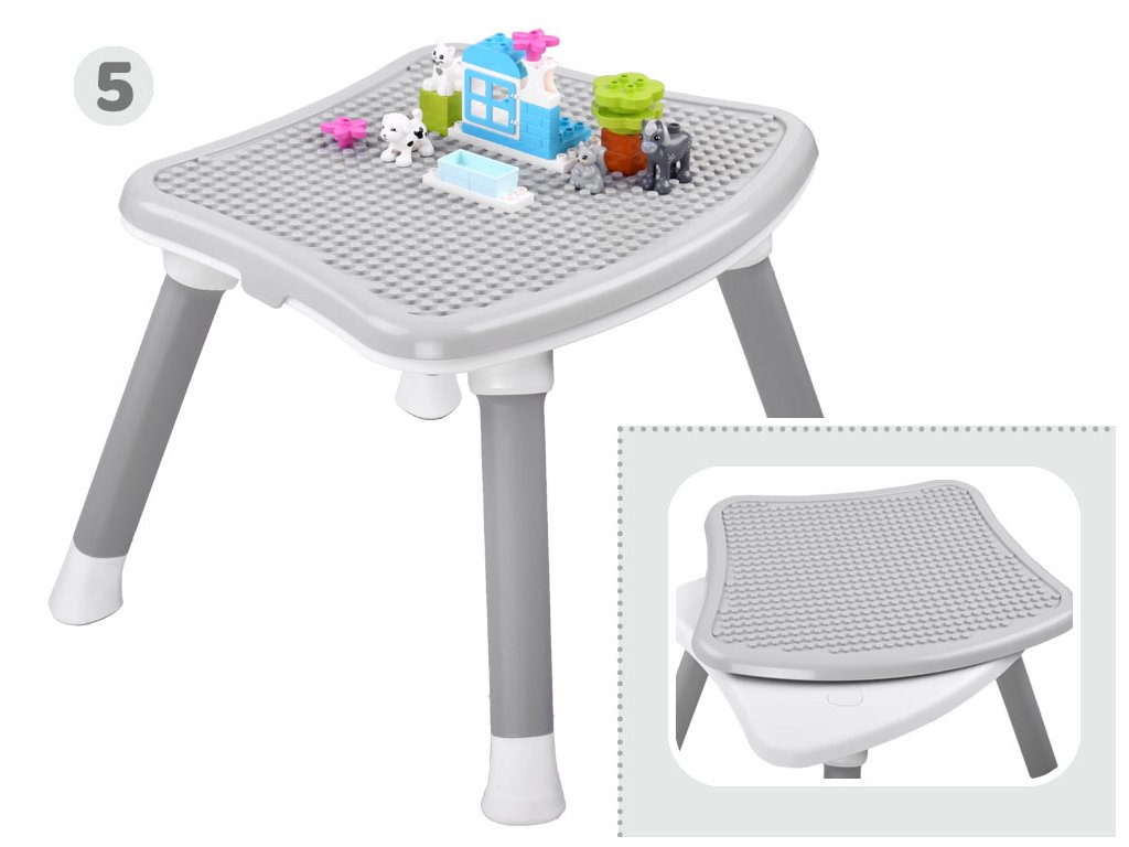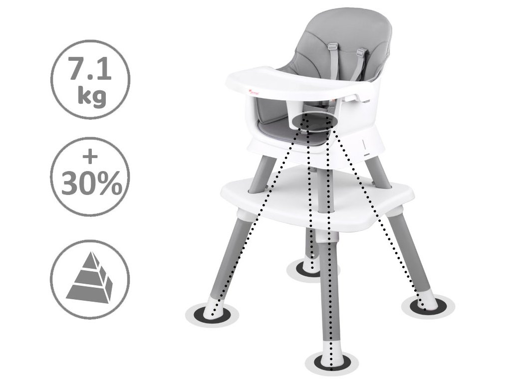 Dětská jídelní židlička 6v1 je ideální pro děti od 6 měsíců, které začaly samy sedět. Skládací židlička v moderním stylu se bude hodit do každého dětského, obývacího pokoje nebo kuchyně. Díky své možnosti použití v různých variantách se hodí jak k jídelnímu stolu, tak do dětského koutku na hraní. Pohodlné, správně profilované sedadlo s pětibodovými bezpečnostními pásy a zámkem proti sklouznutí ze židle. Čalounění použité k čalounění sedačky je prodyšné a ze snadno čistitelného materiálu, který je důležitý pro udržení čistoty nábytku. Židlička má vyjímatelný, snadno čistitelnou plochu ke krmení. Nohy židle mají protiskluzové podložky. Multifunkční židlička poroste s dítětem a snadno se přizpůsobí požadovaným potřebám v dané situaci.