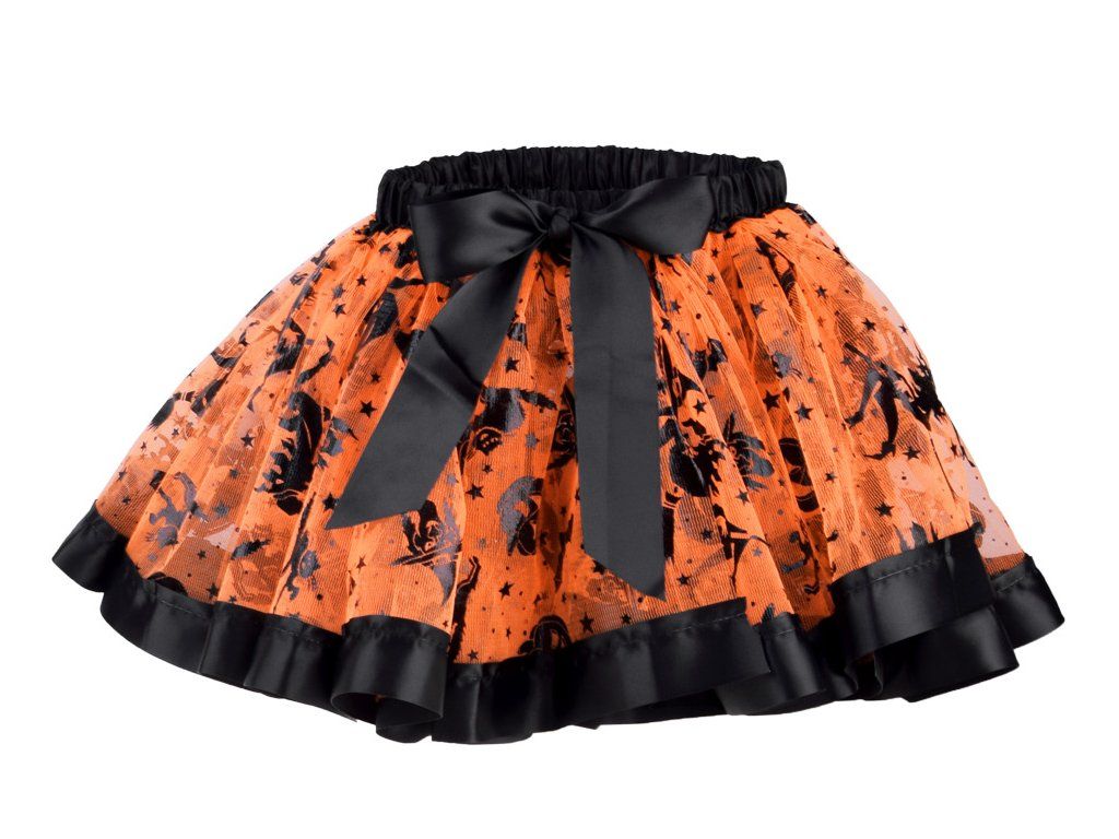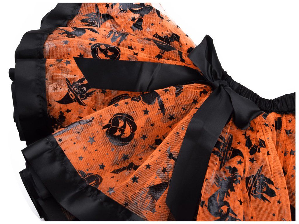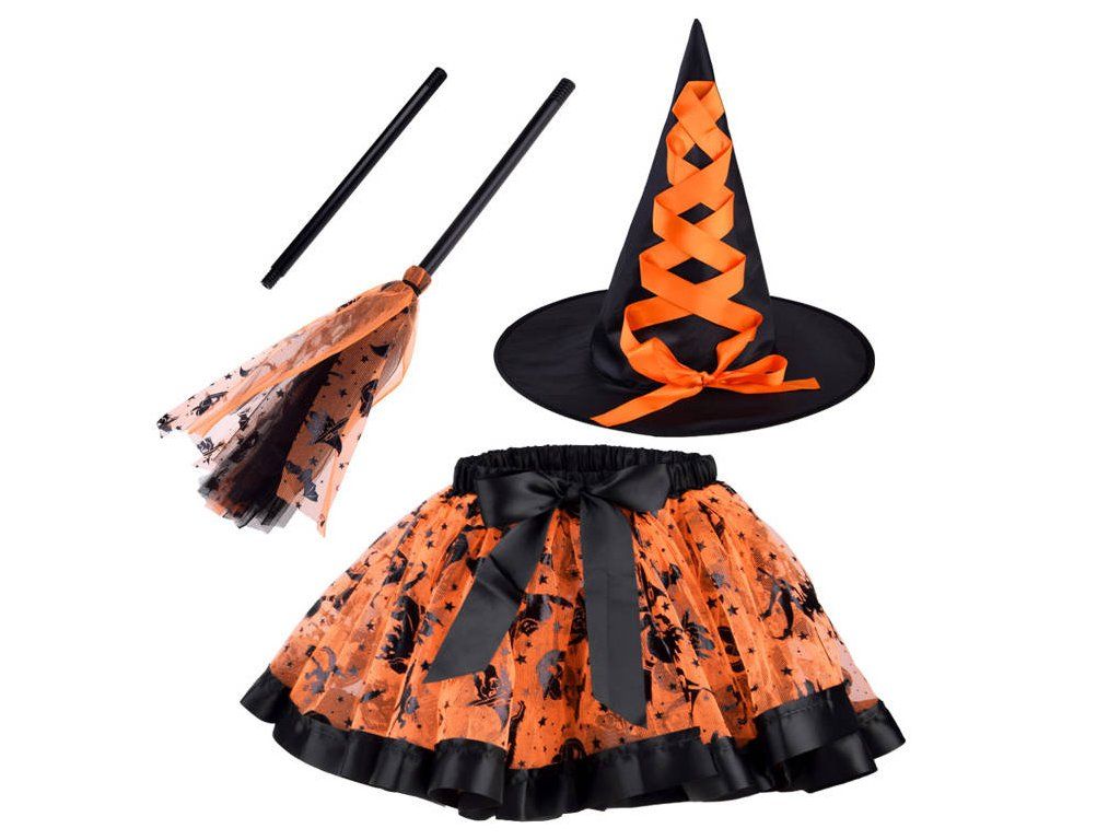Sada obsahuje vše potřebné pro dokonalou transformaci. Základem je nabíraná oranžová sukýnka do gumy, zdobená černou saténovou paspulkou se hravými motivy dýní, koček, čarodějnic a hvězdiček. Tato sukýnka zajišťuje pohodlí a volnost pohybu pro všechny čarodějnické tance a kouzla. Nechybí ani klasický špičatý černý klobouk s elegantní oranžovou saténovou stuhou, který dodá celému vzhledu ten správný tajemný šmrnc a podtrhne autenticitu malé čarodějky.