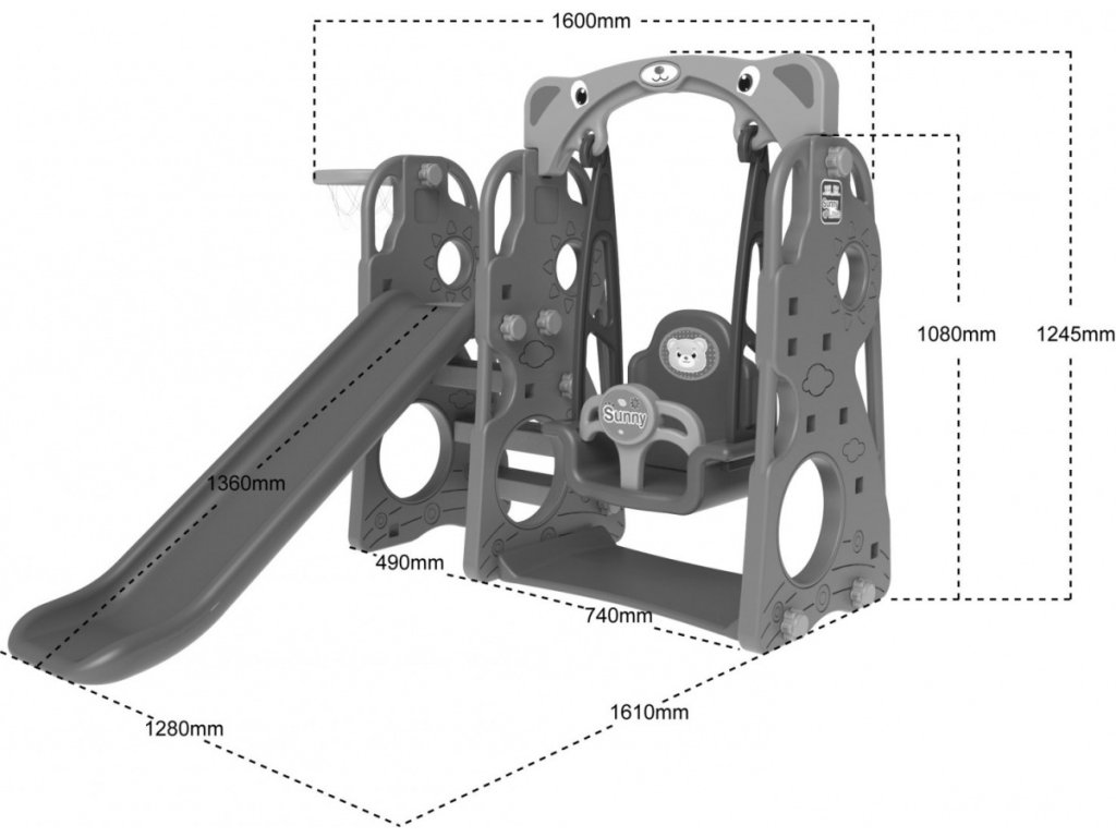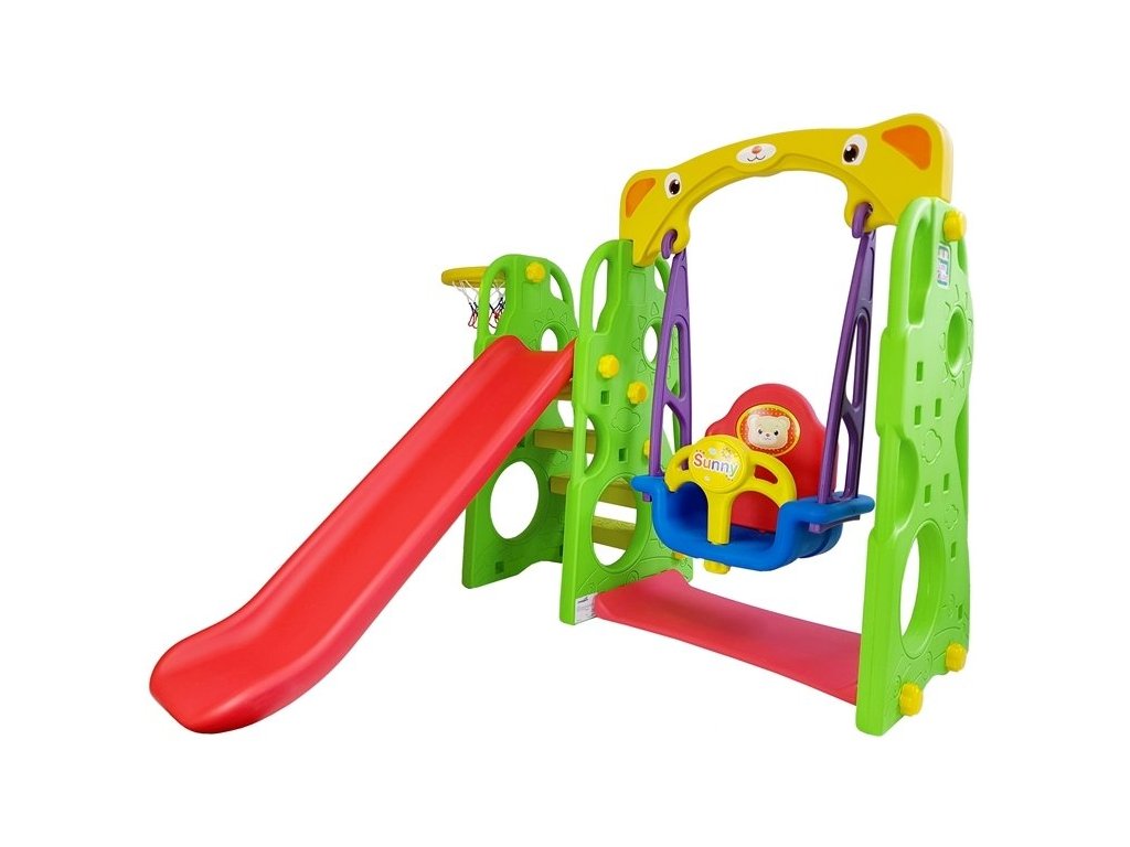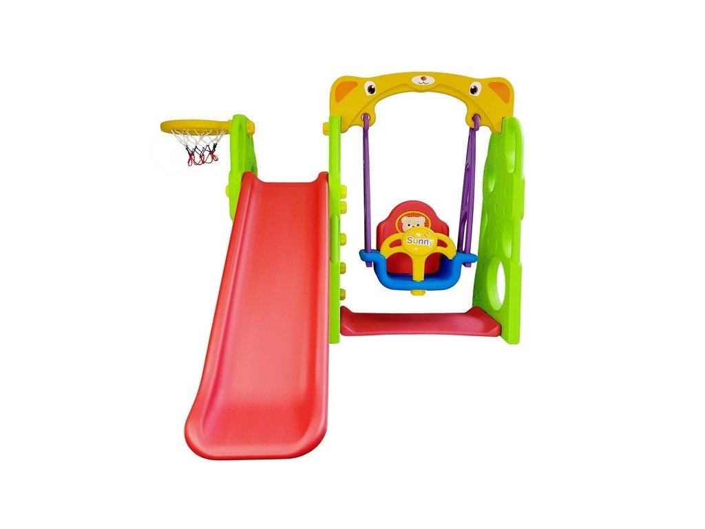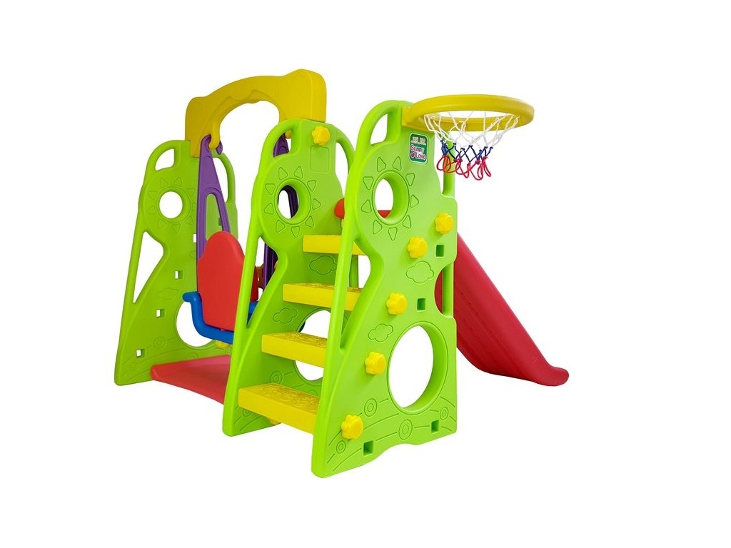 Sestava se skládá z houpačky, skluzavky a basketbalového koše. Tím že tento set kombinuje několik prvků dohromady, můžete poskytnout Vašim dětem spousty zábavy. Sestava lze složit dvěma způsoby, s košem po pravé nebo po levé straně. Skluzavku lze polohovat v závislosti na věku dítěte. Sestava je vhodná do interiéru i na zahradu.