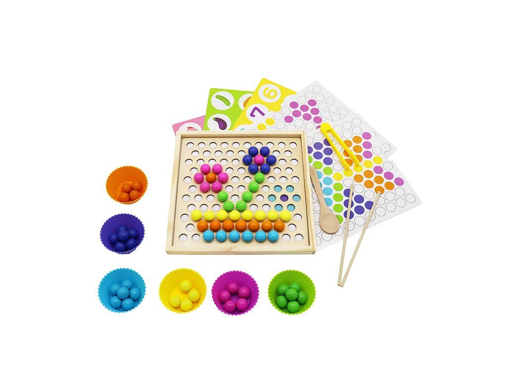 Bohatě vybavená sada umožní dítěti procvičovat různé úkoly jako aranžování obrázků pomocí mnoha kuliček různých barev, rozeznávání tvarů, barev, čísel, zvířat, zeleni a ovoce.