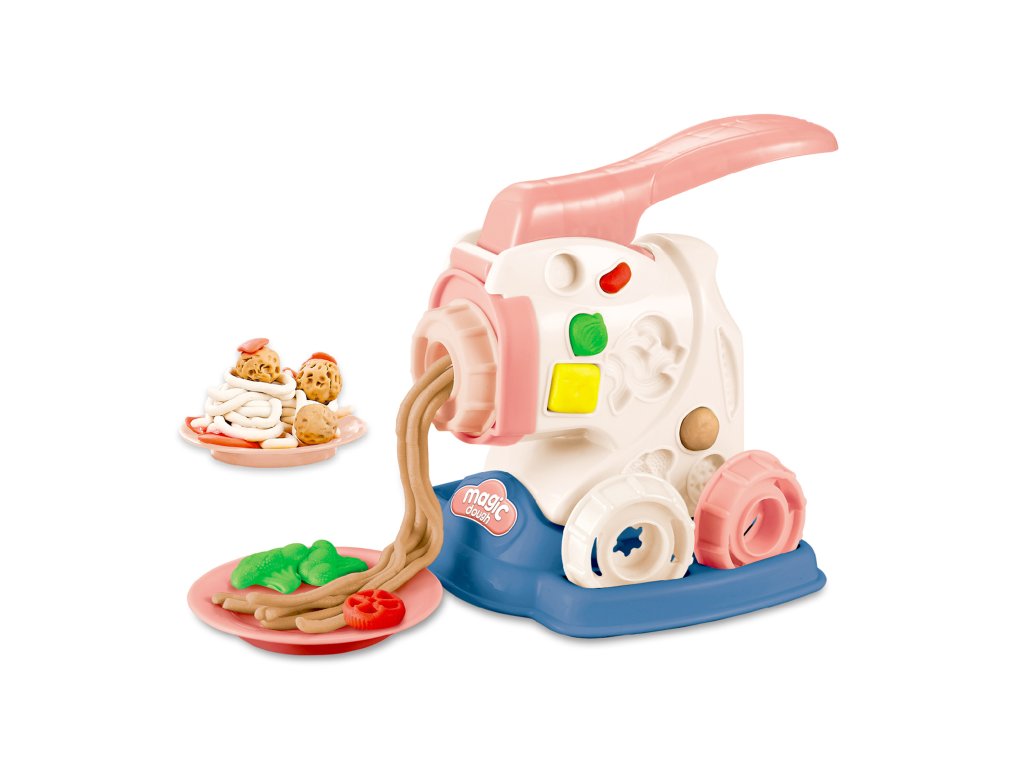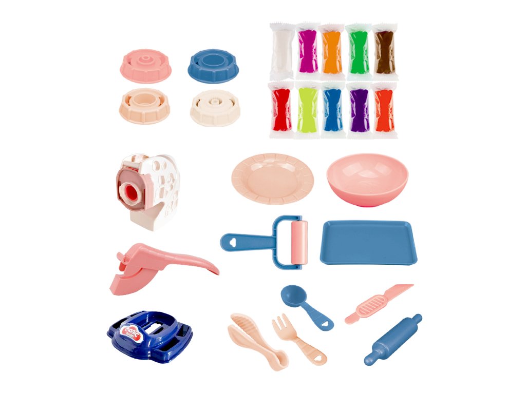 Vytvořte si vlastní jídlo pomocí modelovací hmoty. Různé druhy těstovin a zeleniny. Pomocí vytlačovacího stroje jsi děti vytvoří vlastní těstoviny. Strojek má 4 vzory.