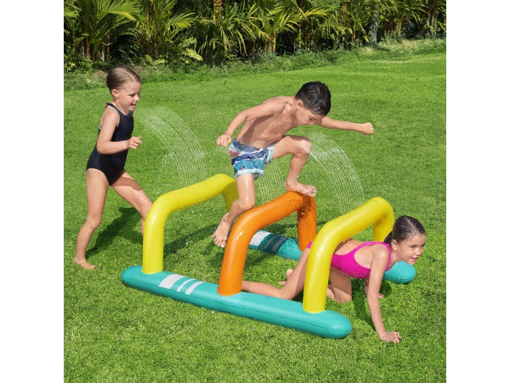 Nafukovací hračka na vodu Překážky je skvělým řešením pro trávení volného času. Je určena pro venkovní hru. Po připojení na zahradní hadici z horní části hračky začne proudit příjemný proud vody. Hra bude stimulovat představivost vašeho dítěte a bude motivovat ke hraní venku. Skvělá hračka je zábavný a bezpečný způsob, jak ochladit celou rodinu. Hračka určená pro děti starší 3 let.Technické parametry: