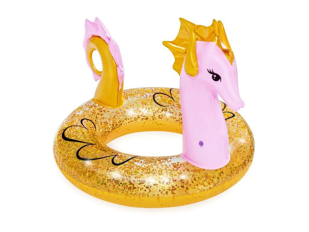 Nafukovací kruh Glitter Seahorse 115 x 104 cm od Bestway, ve tvaru mořského koníka se třpytem, potěší malé i velké a přinese spoustu zábavy ve vodě. Velký průměr kola umožňuje dlouhé plavání a lenošení ve vodě na slunci. Výrobek je určen pro děti od 10 let.Technické parametry: