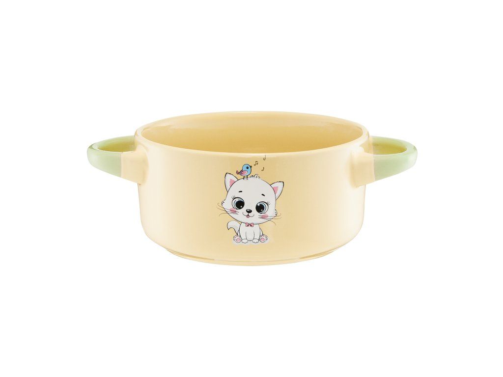 Miska s úchyty a s motivem koťátka s ptáčkem je perfektní nádobou pro každé malé dítě. Její zaoblený tvar, pastelové barvy a dva boční úchyty vytvářejí ideální podmínky pro výuku samostatnosti při jídle. Kameninová konstrukce zaručuje odolnost při každodenním používání a estetický vzhled vnáší do dětských jídel veselou atmosféru. Funguje skvěle doma, ale i na pikniku, ve školce nebo na cestách.
