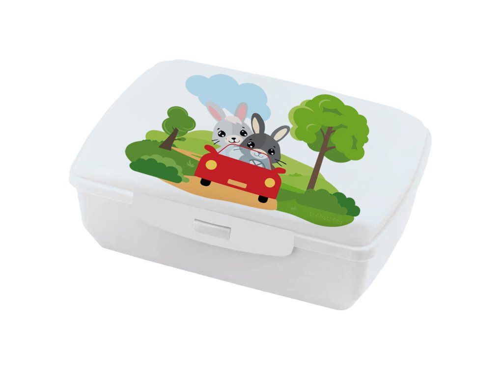 Box na svačinu či oběd s motivem roztomilých zajíčků v autě je dokonalým řešením pro transport občerstvení. Vybízí k jídlu ve škole i na výletech. Lunchbox je vyrobený z bezpečných a odolných materiálů, dokonale ochrání pokrmy, ať už se jedná o sendviče, ovoce nebo jiné svačiny. Díky snadnému čištění a hygienickým vlastnostem je praktickou volbou jak do školy tak na výlety.