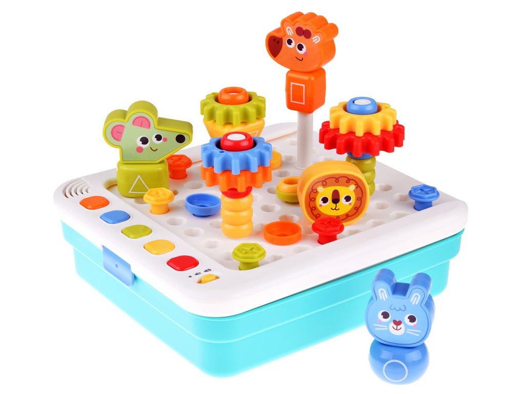 - barevné kostičky, ozubená kolečka, figurky zvířátek: žirafa, králík, myš, lev,