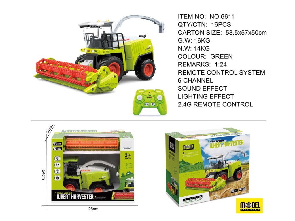 Kombajn na obilí R/C je úžasná hračka pro malé zemědělce od 3 let, která nabízí realistický zážitek z ovládání zemědělského stroje. Tento věrně zpracovaný kombajn je vybaven efekty zvuku a světla, které napodobují skutečný provoz stroje. Díky otočné a zvedací násypné rouře, pohyblivým řezacím diskům a odpojitelnému hederu umožňuje dětem prozkoumat všechny funkce, které kombajn může nabídnout. Pevné gumové pneumatiky zajišťují dobrou přilnavost k povrchu, zatímco dálkové ovládání na frekvenci 2,4 GHz poskytuje možnost jízdy ve všech směrech a nastavení úhlu zatáčení. Kombajn může být napájen akumulátorem 3,7 V 500mAh, který je součástí balení, a také nabízí demo režim pro předvedení všech funkcí.