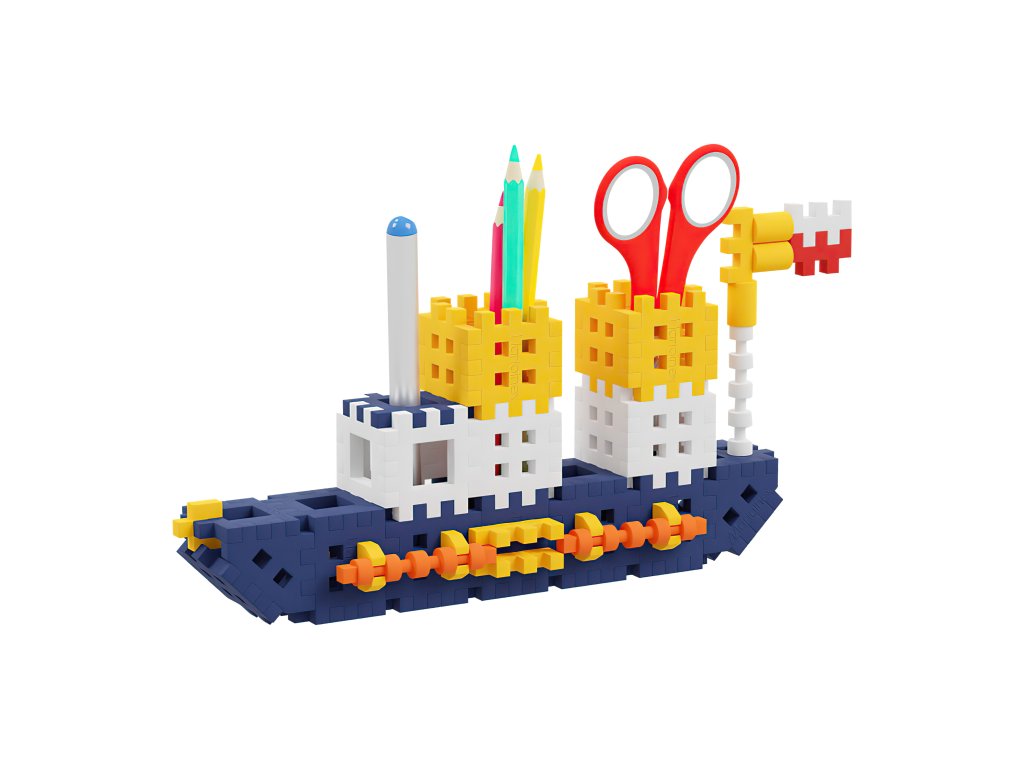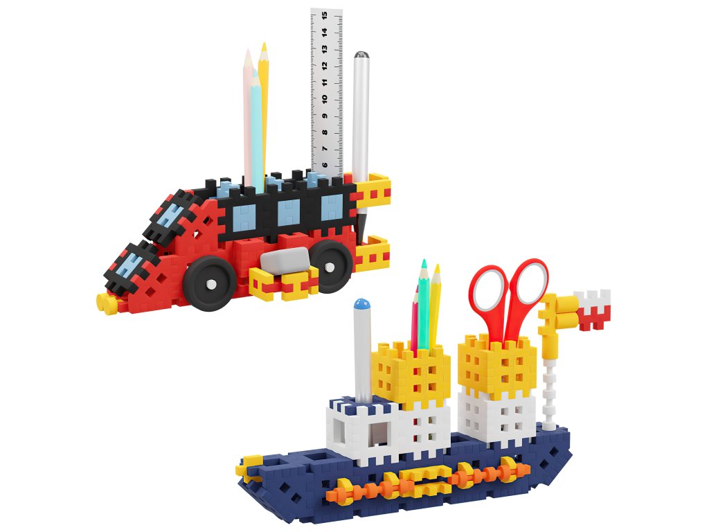 Sestavte si vlastní organizéry na psací a výtvarné potřeby. Získáte tak kreativní a velmi praktickou dekoraci pracovního stolu. Sada se skládá ze 140 prvků vytvoříte z nich organizér ve tvaru auta a lodi, které pojmou všechny potřebné školní potřeby.