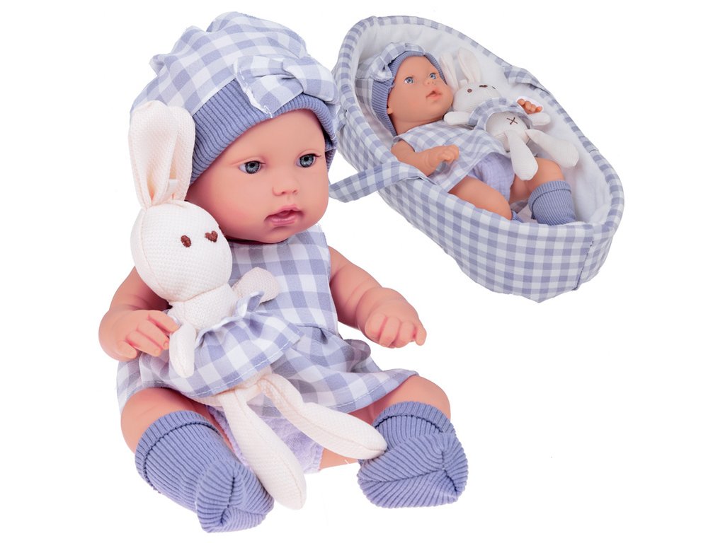 Tato realistická novorozenecká panenka je nejen neobyčejně věrohodná, ale také skvělá společnice pro kreativní hru a rozvoj dětské fantazie i empatie. Jemné rysy a proporce panenky dávají pocit, jako by dítě drželo skutečné miminko. Součástí je i roztomilý králíček, který má sukénku ze stejného materiálu jako panenka, takže oba tvoří dokonale sladěnou dvojici. Miminko odpočívá v půvabném košíku s pevnými uchy, které umožňují snadné přenášení; košík je barevně sladěný s oblečky. Panenka je oblečena do šedé čepičky s jemným kostkovaným vzorem a šatiček v odpovídajícím šedém odstínu, na nožičkách má měkké ponožky. Je vyrobena z kvalitních, bezpečných materiálů, má pohyblivé končetiny a díky celoplastovému provedení se snadno udržuje čistá. Oblečky jsou precizně ušité, což umocňuje realistický dojem.