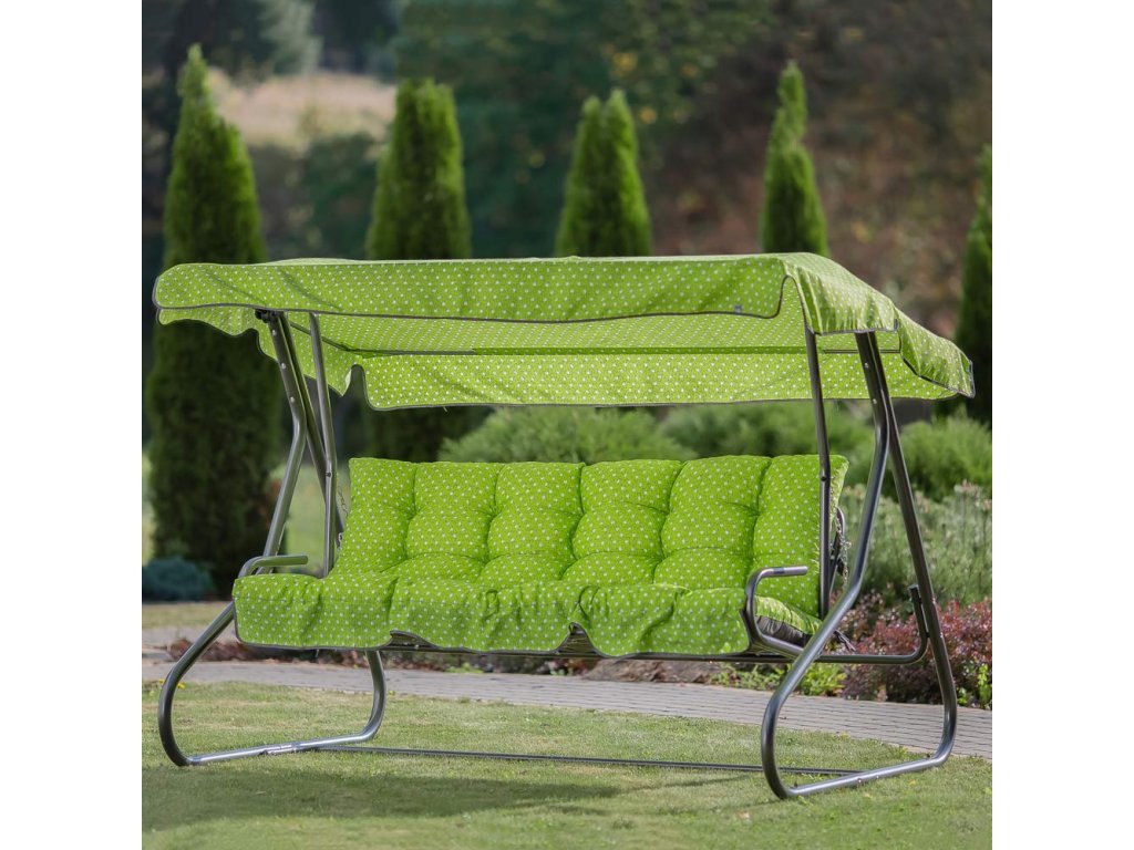Komfortní sedáky a stříška na houpačku. Pohodlné a stylové posezení zaručí tato sada podušek skládající se ze sedáku na sedadlo, sedáku na opěradlo a stříšky. Vrch sedáků je vyrobený z bavlněno-polyesterové tkaniny (48% bavlna, 52% polyester), spodek z polypropylenu. Obšito barevným polyesterovým lemem sladěným s tkaninou. Sedáky mají šňůrky pro připevnění k rámu a dekorativní prošití. Stříška je ze stejné tkaniny a ve stejném vzoru jako sedáky. Sedáky a stříška se zeleno-bílým, puntíkovaným vzorem, budou jistě ozdobou vaší houpačky. Tato sada sedáků se stříškou sedí na houpačky z naší nabídky Parma a Milano od výrobce Patio.