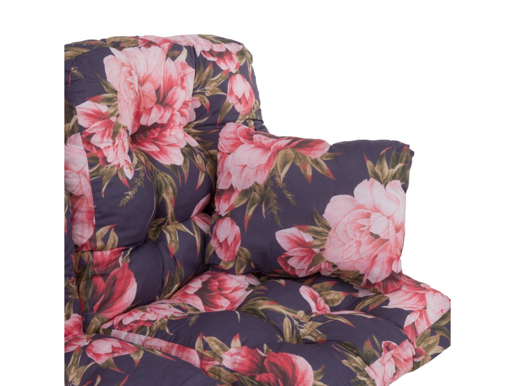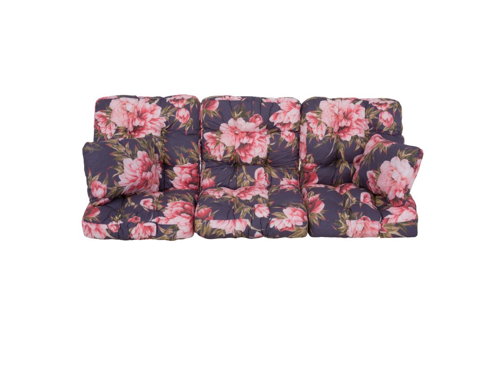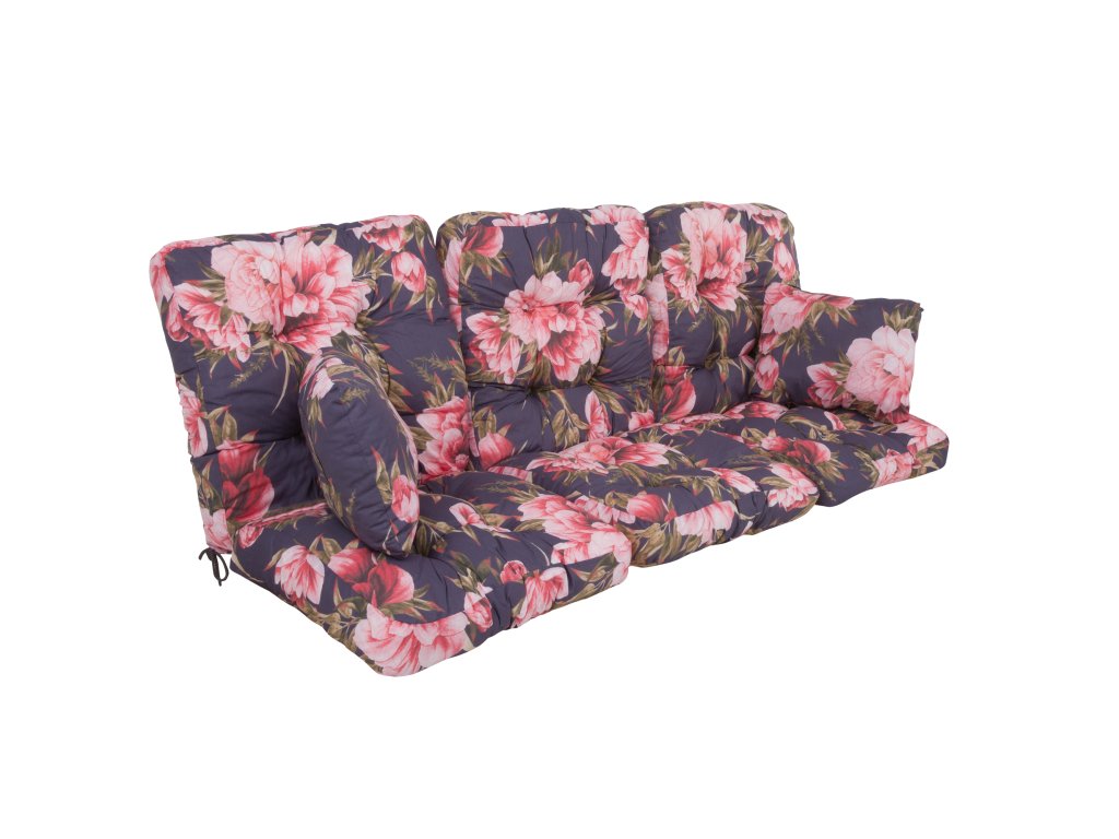Sada hrubých sedáků, s výrazným, květinovým vzorem na tmavě modrém pozadí, je vyrobená z bavlněno-polyesterové tkaniny a výplň je z řezané houbičky Flocke. Každý sedák v sadě je prošívaný, což umožňuje rovnoměrné rozložení výplně. Sedáky jsou obšity polyesterovým lemem a v ohbí jsou šňůrky pro připevnění k rámu. Sedáky jsou vhodné na houpačky Celebes a Celebes Plus z naší nabídky.