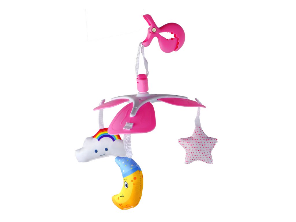 Růžový kolotoč do postýlky se zvukovou funkcí je estetická a funkční hračka, která se perfektně hodí jako doplněk dětské výbavičky. Navrženo s ohledem na nejmladší, kombinuje jemné plyšové přívěsky, praktický klip pro upevnění a vestavěný hudební a rotační mechanismus, který stimuluje smysly dítěte a pomáhá mu se uklidnit. Kolotoč je vybaven speciálním, bezpečným klipem, který umožňuje rychlou a stabilní instalaci na různých místech - na okraji postele, rukojeti kočárku, popruzích dětského nosiče nebo autosedačky. Díky této mobilitě si hračku lze snadno vzít kamkoli s sebou a poskytnout tak vašemu dítěti známé podněty doma i na cestách. Toto je pohodlné řešení pro rodiče a bezpečná zábava pro děti. Sada obsahuje tři měkké, okouzlující přívěsky: měsíc a dva mraky zdobené decentními hvězdami. Jejich příjemná textura a pastelové barvy přitahují pozornost dítěte, stimulují jeho zvědavost a podporují rozvoj zraku, hmatu a koordinace. Přívěsky se jemně pohybují s pohybem kolotoče a vytvářejí tak hypnotizující tanec, který má uklidňující účinek. Další výhodou kolotoče je možnost aktivovat klidnou, uklidňující melodii, která doprovází pomalé, plynulé otáčení hraček. Dítě může pozorovat měkké přívěsky v pohybu, což vytváří pocit bezpečí a podporuje klidný spánek.