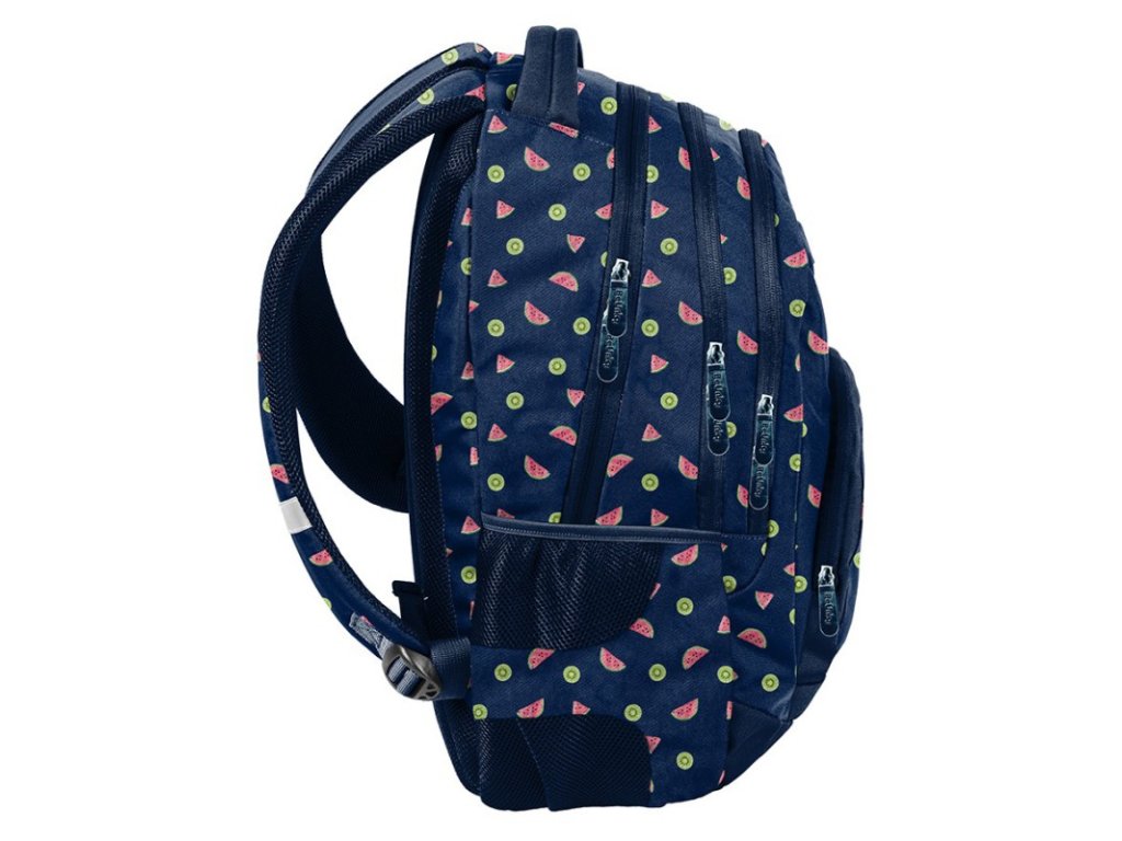 Má tři prostorné přihrádky, přední kapsu na zip s organizérem a dvě boční kapsy ze síťoviny a látky na láhev nebo termosku.