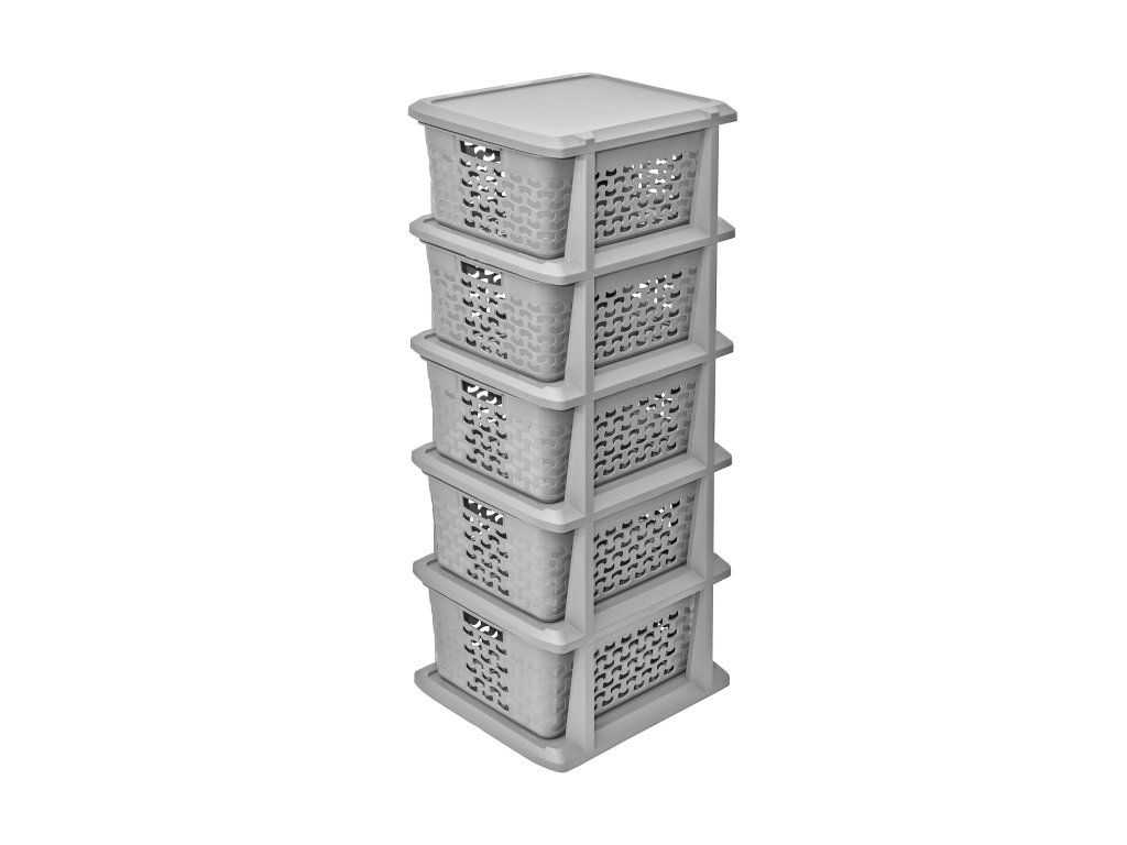 Víceúrovňový regál s pěti prostornými košíky je funkčním a estetickým úložným řešením pro domácnost, kancelář nebo pro technické místnosti. Košíky fungují jako zásuvky a vyznačují se moderním geometrickým vzorem, který dodává regálu moderní charakter. Regál je vyrobený z vysoce kvalitního plastového materiálu odolného vůči vlhkosti, díky čemuž je vhodný i do místností vystavených vlhosti. Hladký vnitřek košíků zabraňuje poškození látek a lehká konstrukce usnadňuje přenášení. Udržování regálu v čistotě je extrémně snadné - stačí ho otřít vlhkým hadříkem.