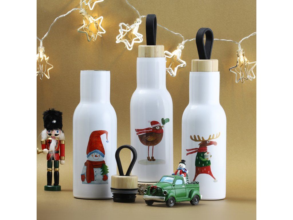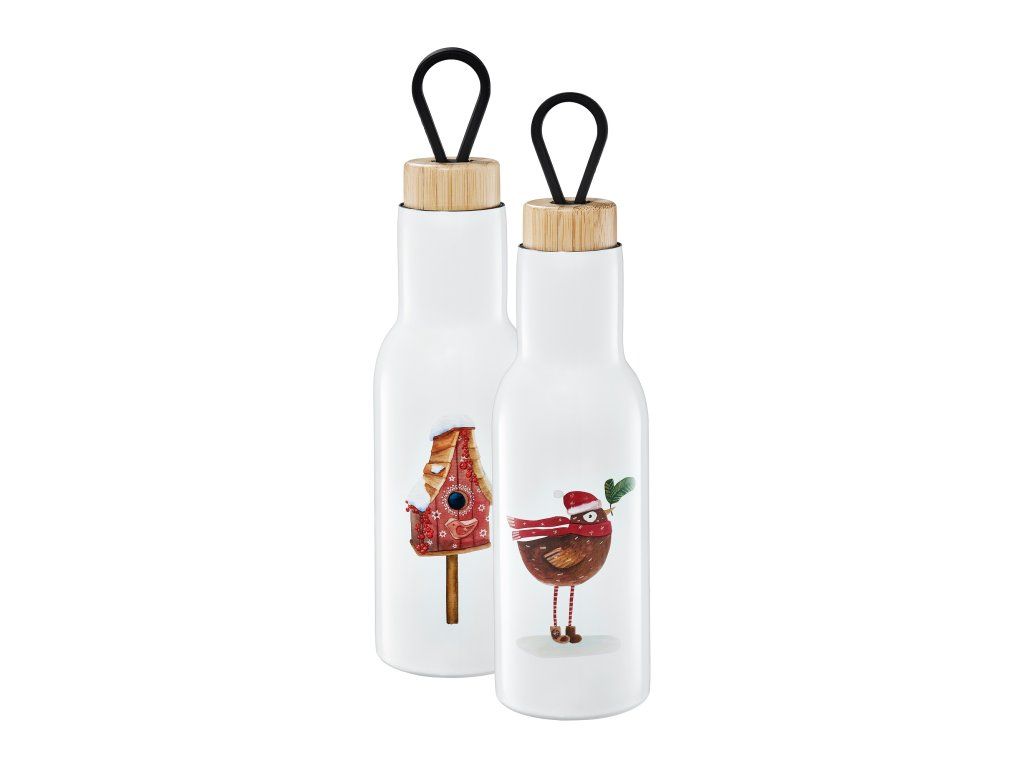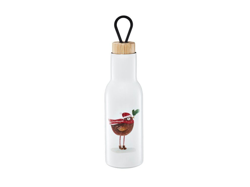 Láhev se zimním motivem je nutností v zimní sezóně. Náladu v mrazivém dni vám zlepší teplý nápoj, horký čaj nebo lahodné kakao. Nápoj si můžete vzít všude, do školy nebo na procházku. Láhev má roztomilý motiv zimního ptáčka s malou větvičkou a krmítkem. Vyrobeno z nerezové oceli. Láhev má dřevěný korkový uzávěr a silikonové poutko. Celkový objem po okraj je 400 ml.