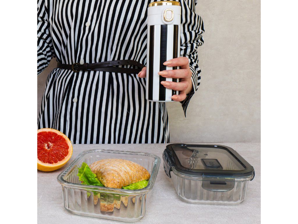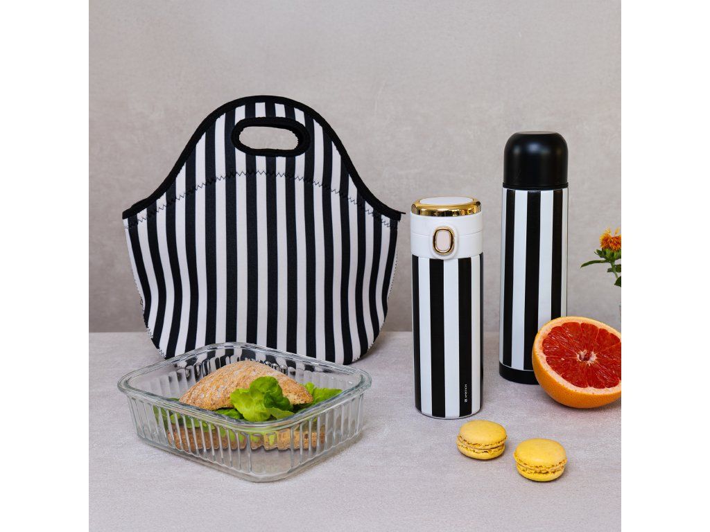Termohrnek Ribs kombinuje funkčnost s módním designem. Černobílé pruhy v kombinaci se zlatým akcentem mu dodávájí jedinečný charakter, díky čemuž je nejen praktickým, ale i módním doplňkem pro každodenní použití. Termohrnek je vyrobený z nerezové oceli a je vybavený vakuovou vložkou, která udržuje teplotu teplých i studených nápojů po dlouhou dobu. Díky praktickému systému otevírání tlačítkem a bezpečnostnímu zámku je hrnek skvělým společníkem do práce, na cesty i pro každodenní použití.