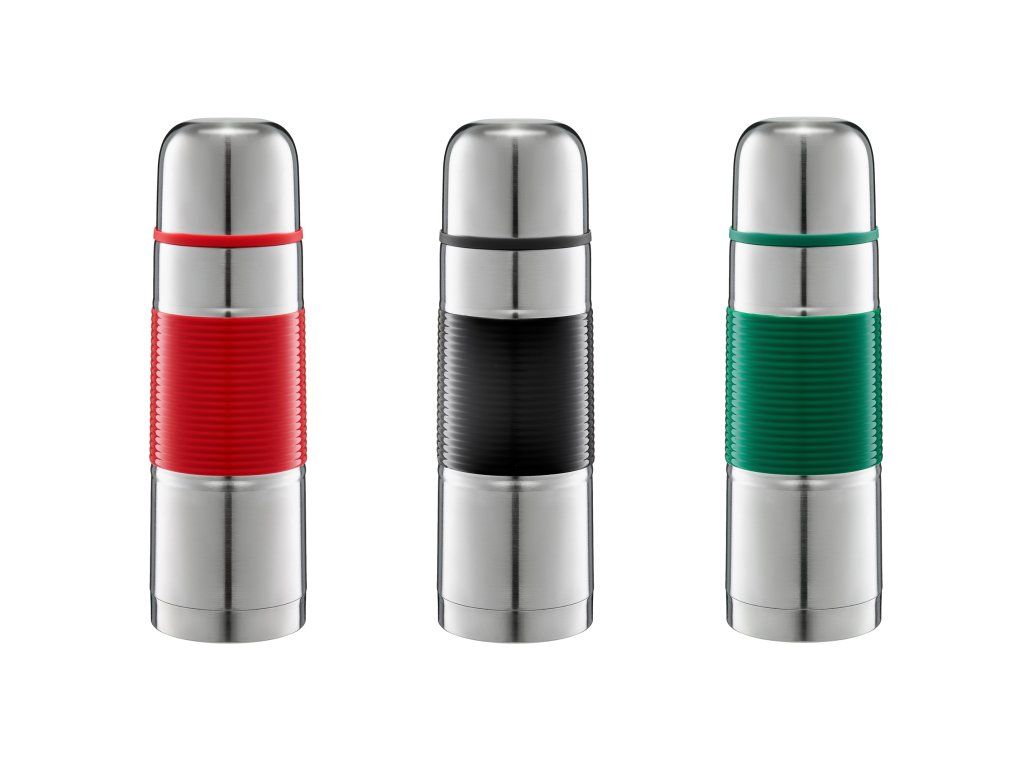Termos Gummy je vyrobený z nerezové oceli a je vybavený silikonovým, protiskluzovým páskem. Silikonový žebrovaný pásek zajišťuje bezpečné držení. Termos je těsný, má automatický uzávěr a vakuově izolovanou nerezovou vložku. Automatický uzávěr zajišťuje těsnost a umožňuje pohodlné nalévání nápojů, aniž byste ho museli úplně vyšroubovat. Káva nebo čaj v termosu několik hodin nevychladne a studený nápoj si také udrží správnou teplotu po delší čas.. Termosy jsou dostupné ve 3 barvách a každá barva je dostupná ve 4 objemech: 350 ml, 500 ml, 750 ml a 1l.Technické parametry: