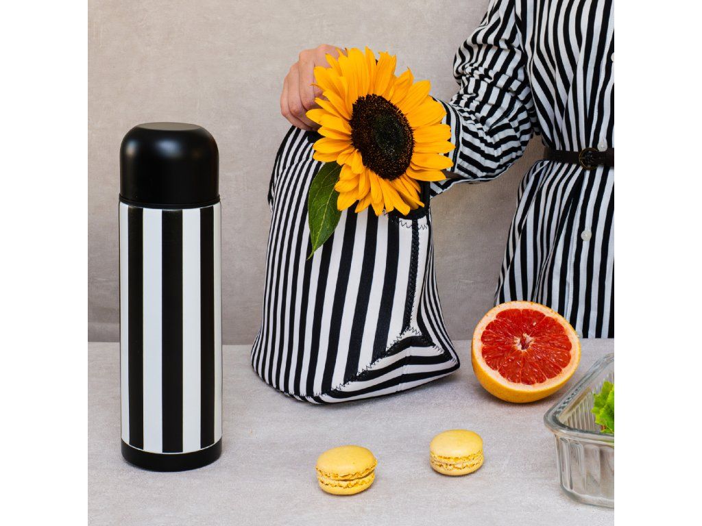Moderní termos Ribs kombinuje funkčnost s osobitým stylem. Jeho geometrický, černobílý pruhovaný vzor mu dodává módní a poutavý charakter. Vnitřek je vyroben z nerezové oceli a vakuově izolovaná konstrukce umožňuje, aby nápoje zůstaly dlouho teplé nebo studené. Automatický uzávěr zajišťuje těsné utěsnění a pohodlné používání a také nalévání bez toho aby jste museli víčko zcela odšroubovat. Termos bude perfektním společníkem pro každodenní použití – do práce, do školy nebo na cesty.