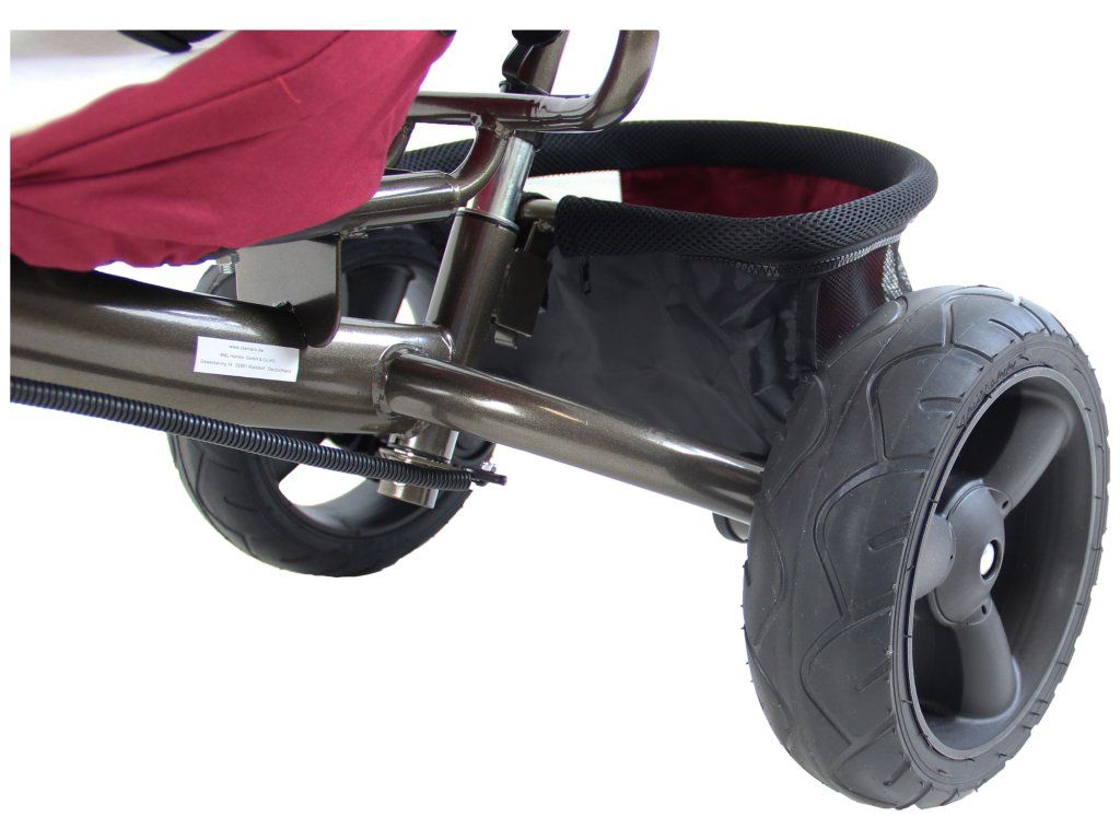 Tříkolka je vybavena hlinikovým rámem, bezpečnostním pásem, protiskluzovými pedály, ergonomický tvarovanými rukojet'mi říditek (gripy), ochrannou stříškou proti slunci a kolečkami opatřenými gumovými běhouny.