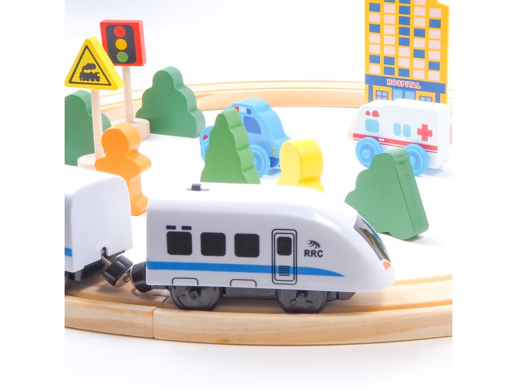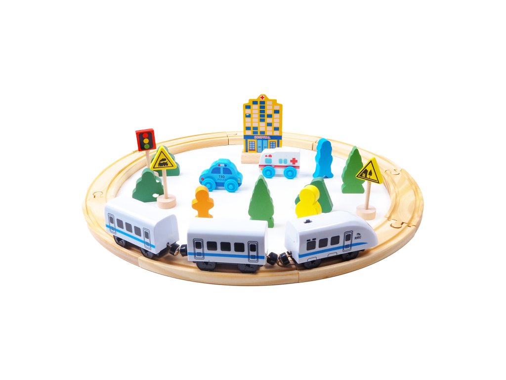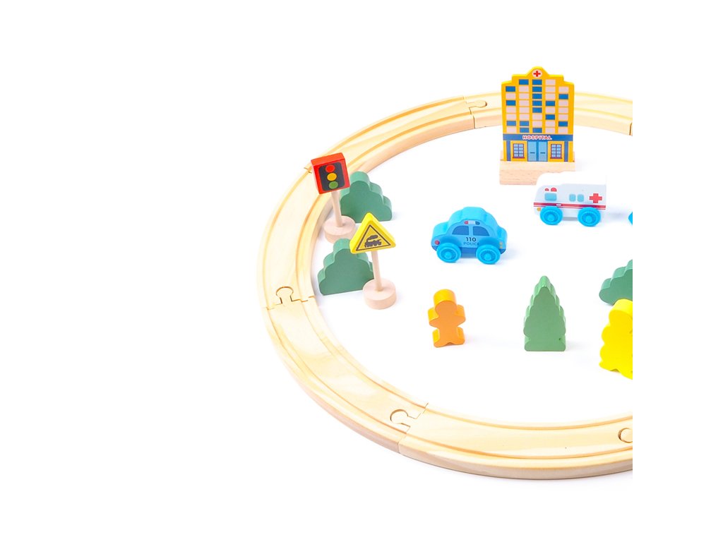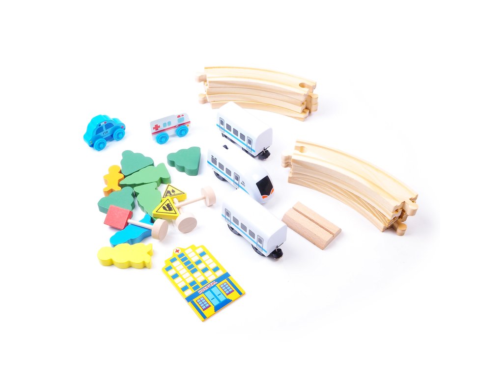 - Sada obsahuje - části kolejnic, vlaky, auta, budovu nemocnice, figurky, dopravní značky a stromy