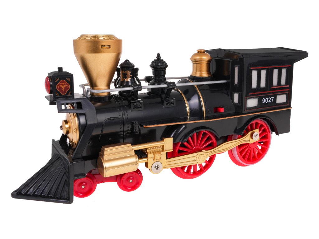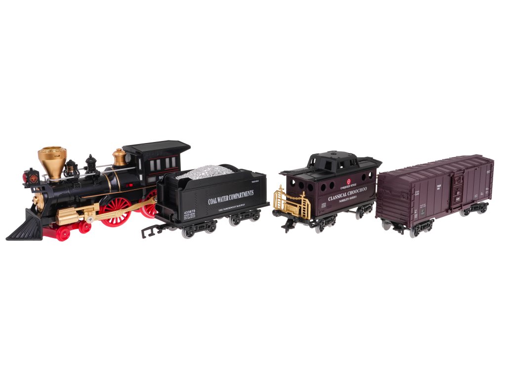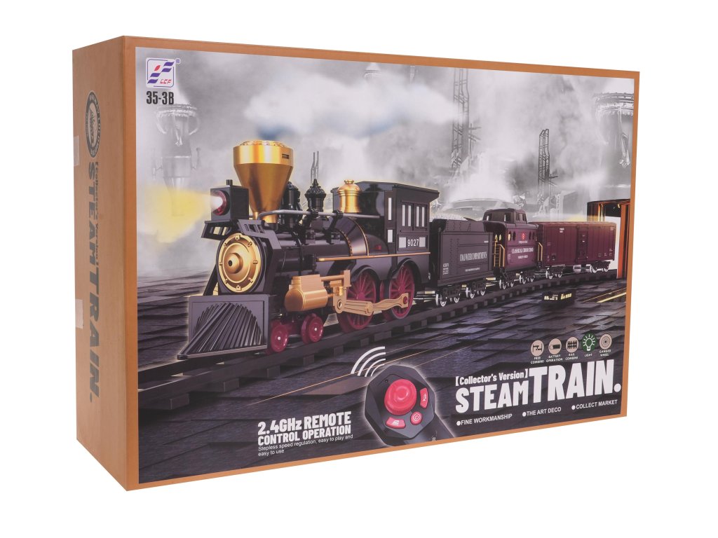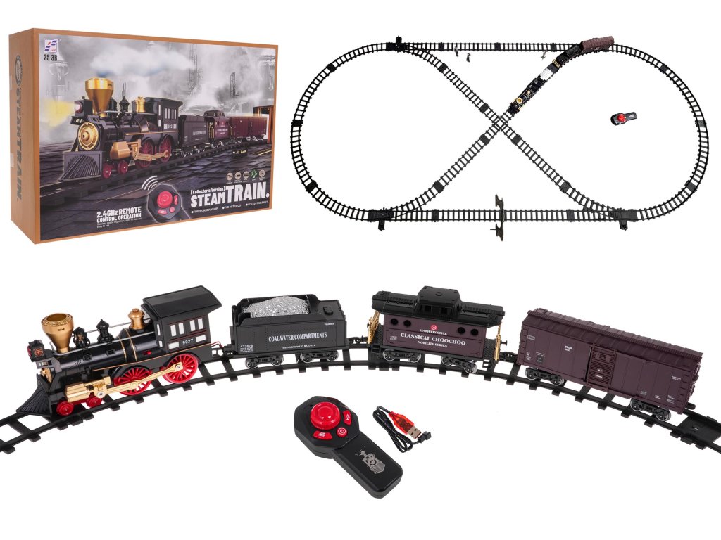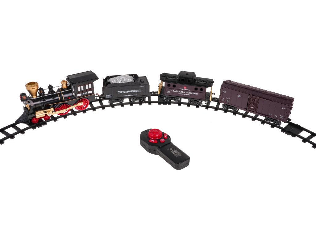 Retro sada vláčků na dálkové ovládání s funkcí kouře, zvuky jízdy a kolejnicemi. Ideální pro děti od 5 let. Hračka je napájena akumulátorem typu 3,7 V (součástí balení), ovladač vyžaduje 2 x AA 1,5 V baterie (nejsou součástí balení). Baterie se vkládají do vagonu s uhlím. Při jízdě lokomotiva vypouští z komínu kouř (po naplnění vody pipetkou, která je součástí sady), navíc svítí přední reflektor. Snadno sestavitelné koleje jsou bezpečné a odolné. Ovladačem lze řídit směr jízdy, rychlost, kouř a zvukové efekty.