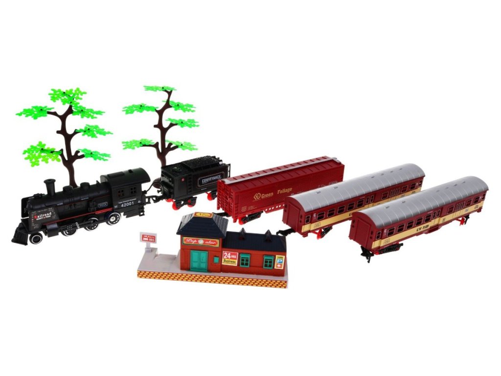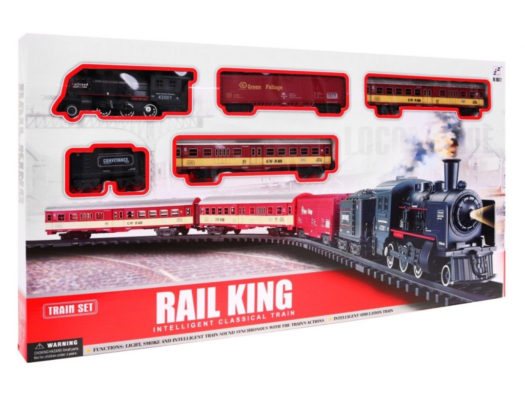Železniční sada s eliptickou tratí, dvěma výhybkami a vnitřním okruhem o rozměrech 78 × 156 cm. Během jízdy lokomotiva vypouští kouř z komína a přední světlo dodává realistický efekt. Snadno spojovatelné koleje zajišťují bezpečné a odolné používání. Napájení probíhá pomocí 4× AA baterií, které se vkládají do nákladního vagonu, ke kterému je připojena lokomotiva. Součástí balení je také lahvička s olejem.