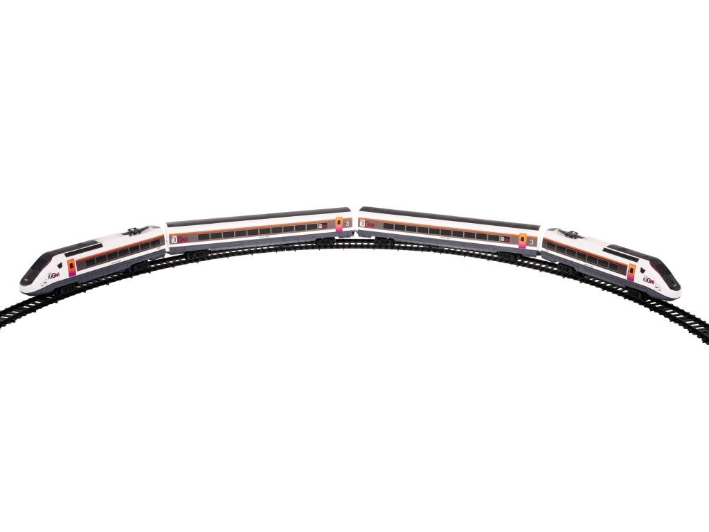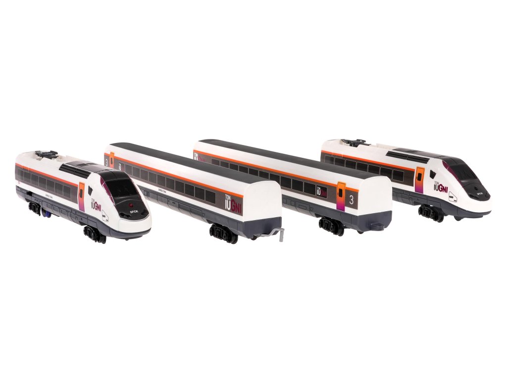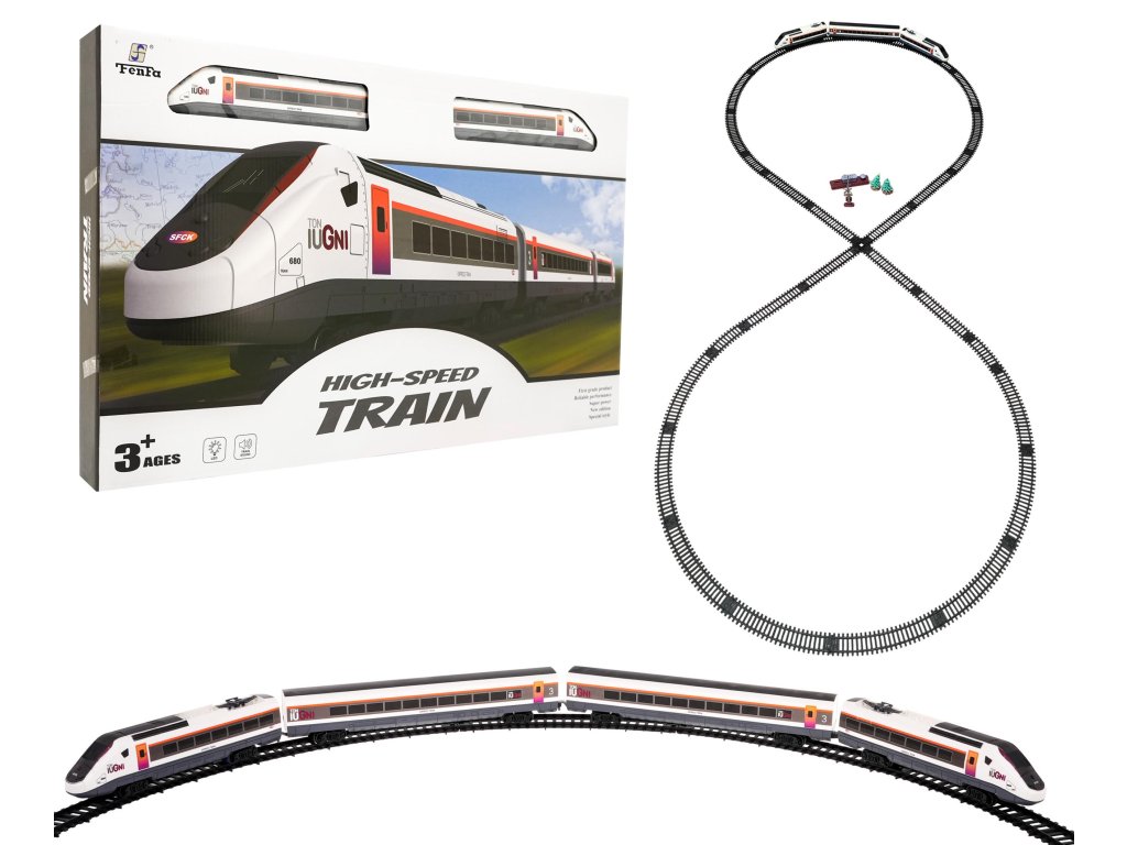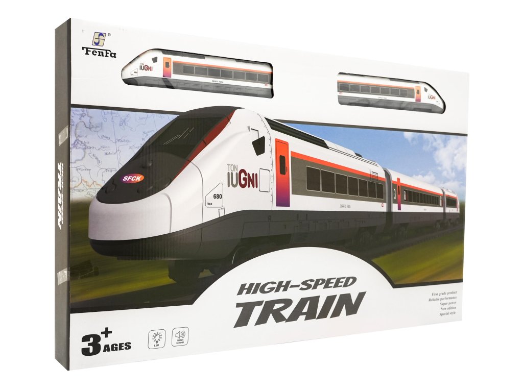 Velká vlaková souprava pro děti od 3 let, obsahující dvě lokomotivy a dva vagony. Jedna lokomotiva je napájena 2× AA bateriemi (nejsou součástí). Kolejka jezdí vpřed, vydává zvuky jízdy a na její přídi svítí červená LED dioda. Součástí jsou koleje, které lze skládat do různých kombinací. Vše je vyrobeno z kvalitního plastu s dlouhou životností a koleje mají snadný systém spojování.