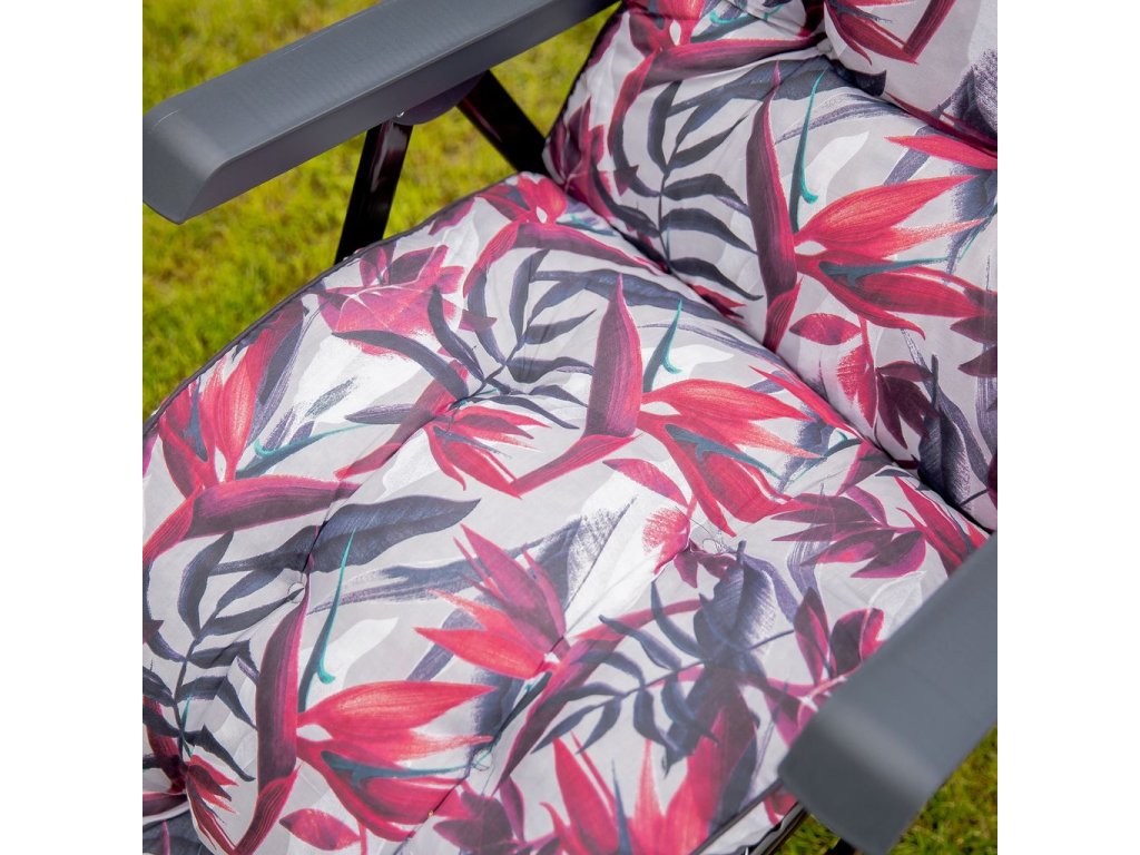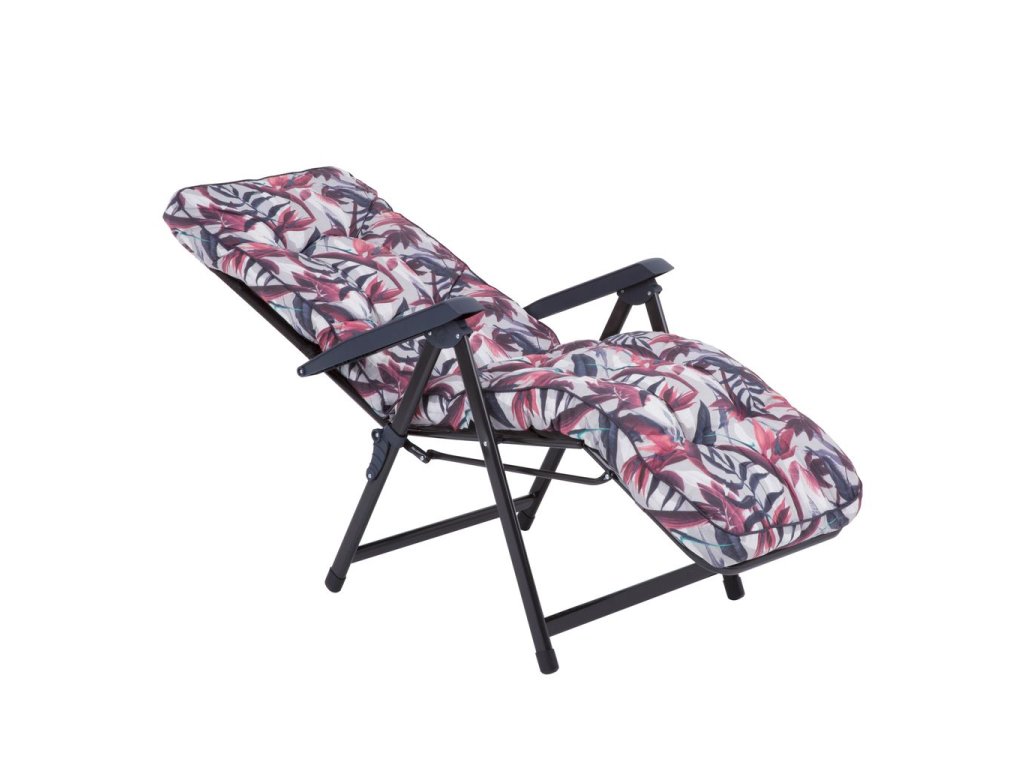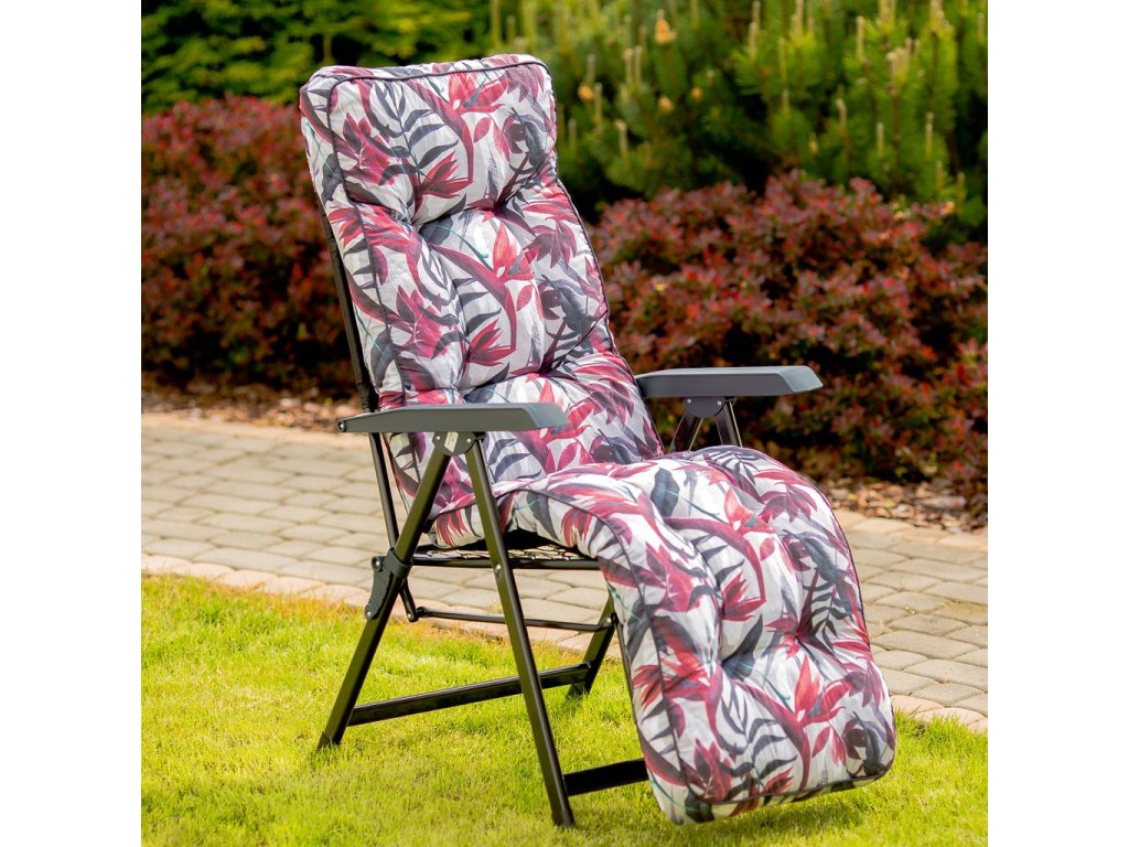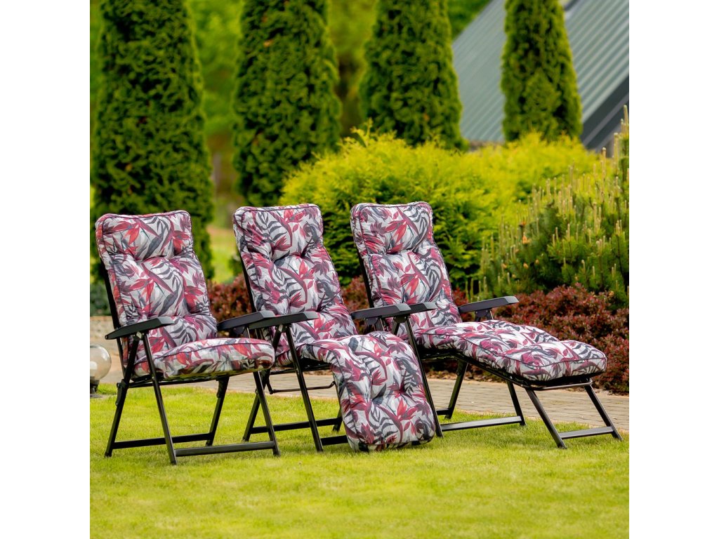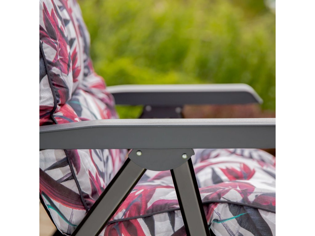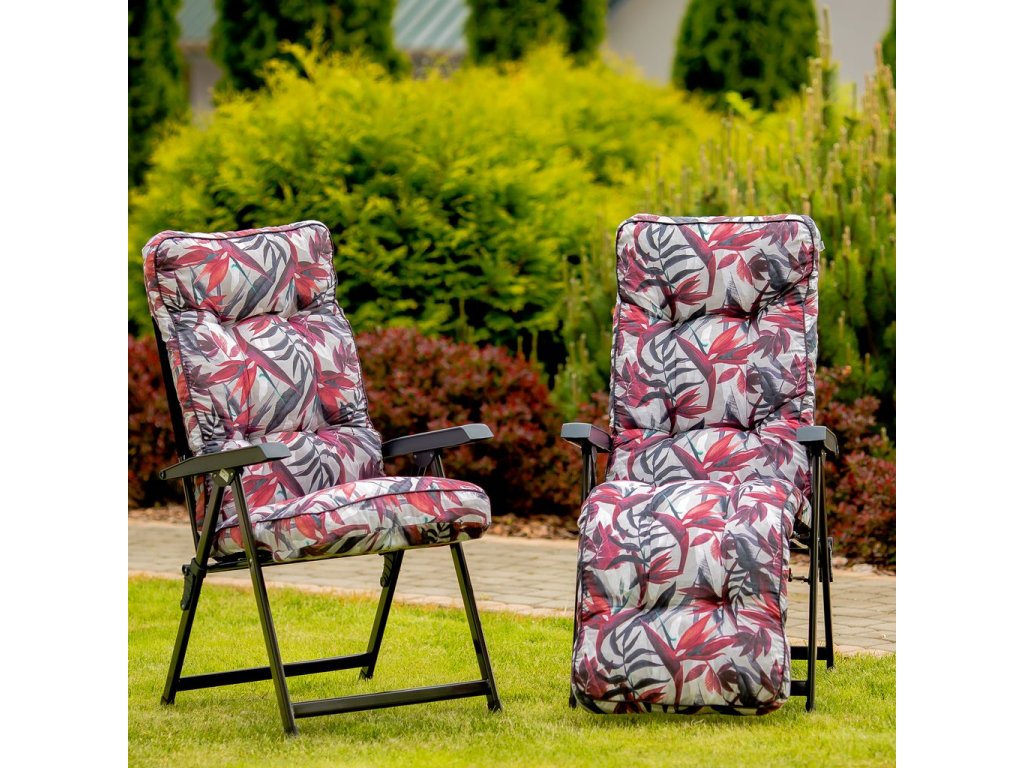 Zahradní polohovací křeslo Lena Plus v různých designech Patio s podnožkou má 6 nastavitelných poloh. Rám má čtvercové opěradlo. Konstrukce je z oválných ocelových trubek 32x18 mm, lakovan práškovou barvou. Sedadlo má novou vylepšenou konstrukci rámu – svařovanou v dolní části nohou - rám je stabilnější a umožňuje i použití křesla uvnitř. Prošívaný sedák, typ modelu Box je naplněn řezanou houbou Flocke 8-10 cm. Vrchní část sedáku je z bavlny a spodní část z lutrasilu. Vrchní a spodní část je spojená bavlněným páskem, sedák je obšitý barevným polyesterovým lemem se šňůrkou. V horní části sedáku je kapsa, která umožňuje připevnění k rámu, v dolní části je pro připevnění gumový pás.